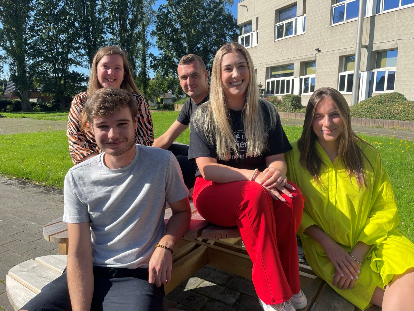 Info: GO! Atheneum Denderleeuw. Op de foto (v.l.n.r.): Vicky Wasteels, Brandon Roelandt, Matthias Schelfthout, Chloë Van der Perre en Amber De Geyseleer.