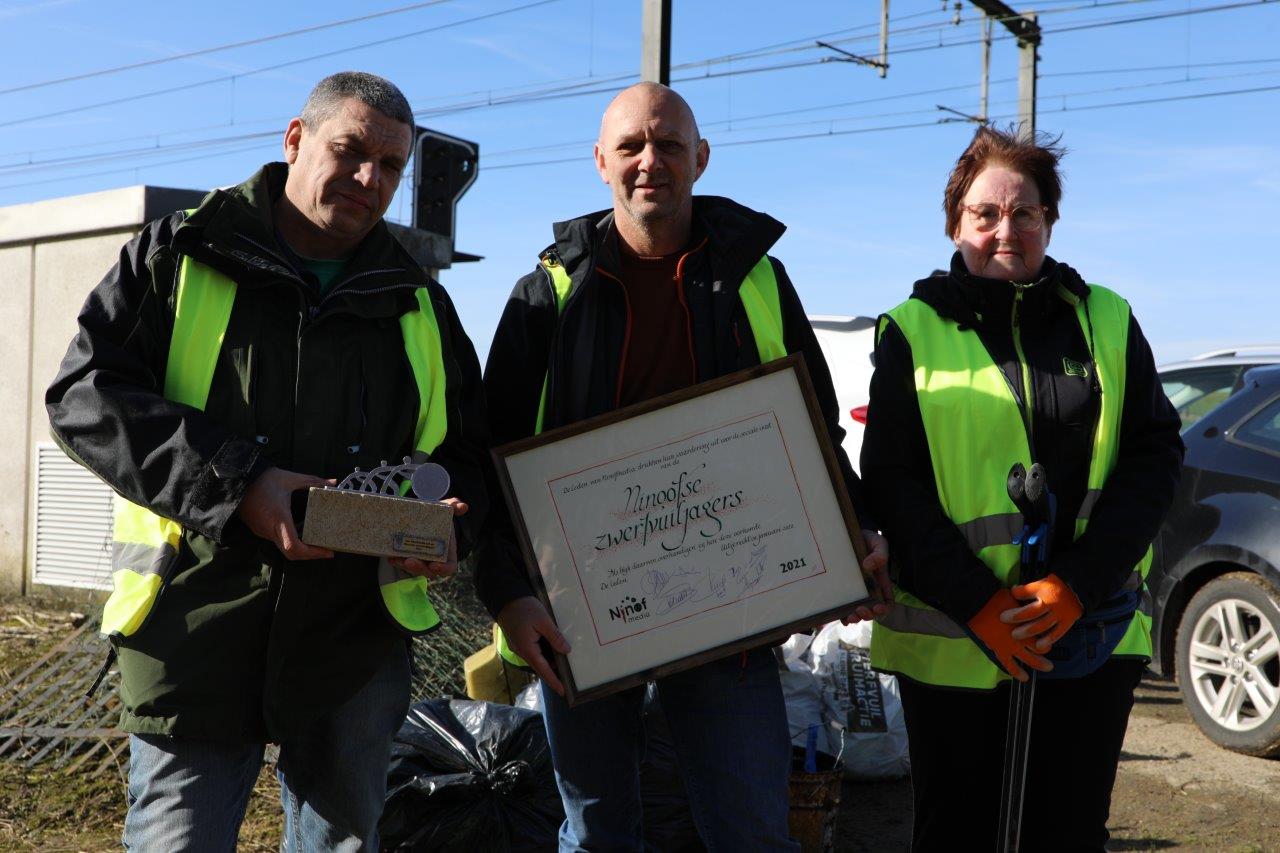 Als tastbare herinnering aan hun inzet, kregen de Ninoofse zwerfvuiljagers een oorkonde overhandigd. Ze is van de hand van de Ninoofse kalligrafe Mathilde Verschelden. Het beeldje, dat zij ook ontvingen, verwijst naar hun gezamenlijke inspanning: ondanks het gevoel van een Sisyfusarbeid, dweilen met de kraan open, vechten tegen de bierkaai, blijven ze doorgaan.