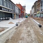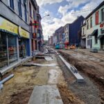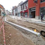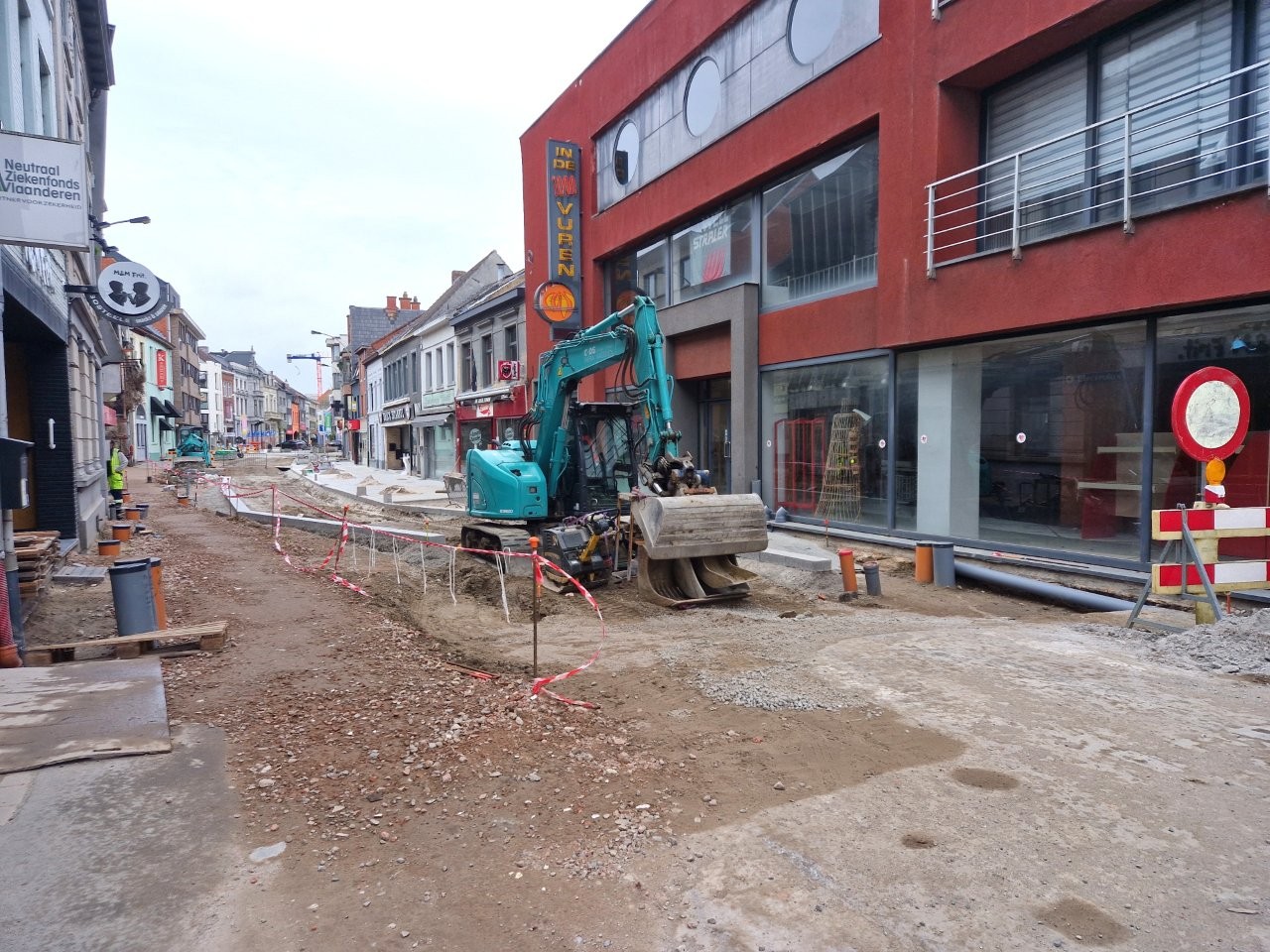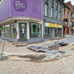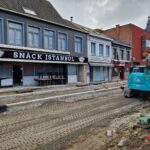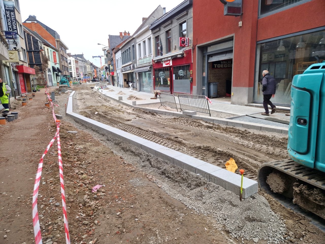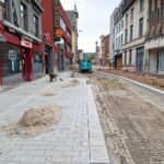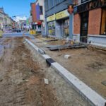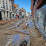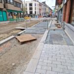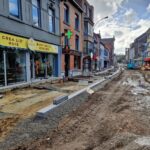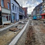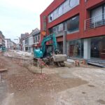 Het deel van de straat tussen de Onderwijslaan en Marktstraat, waar de eerste fase van de werken van start gingen, begint stilaan zijn definitieve vorm aan te nemen. De aanleg van de rioleringen en nutsleidingen is afgerond en de aannemer is gestart met de bovenbouw van het wegdek. De plaatsing van de boordstenen geeft reeds een beeld van het nieuwe wegtracé; ook de plaats van de plantenvakken is langs één zijde van de straat al zichtbaar.
