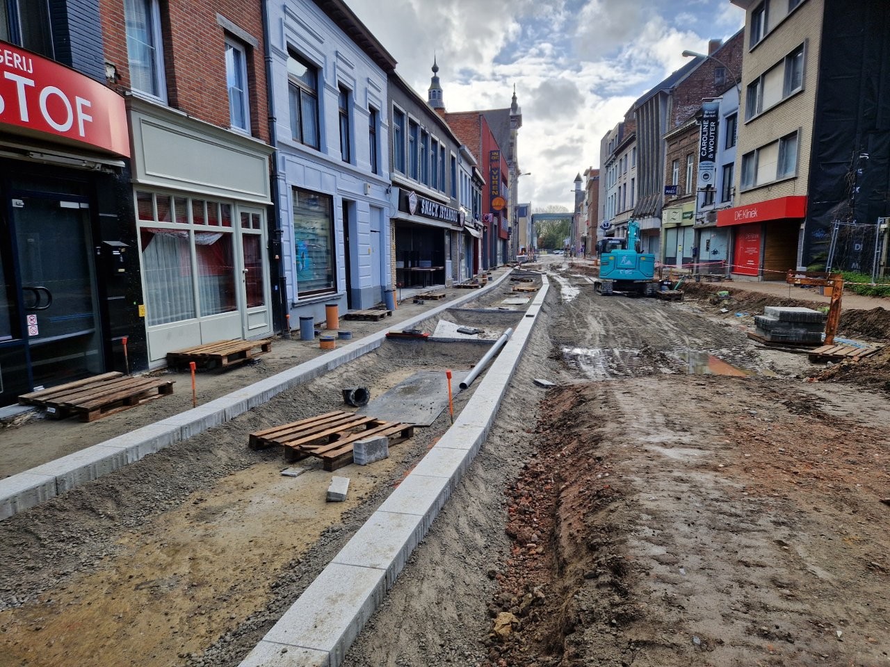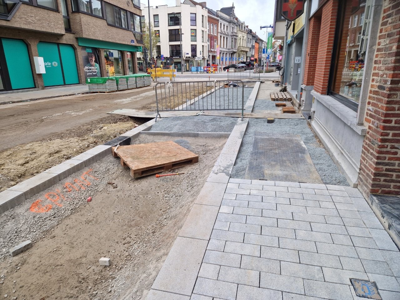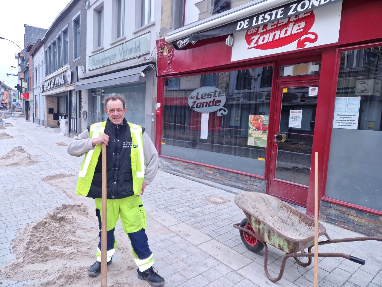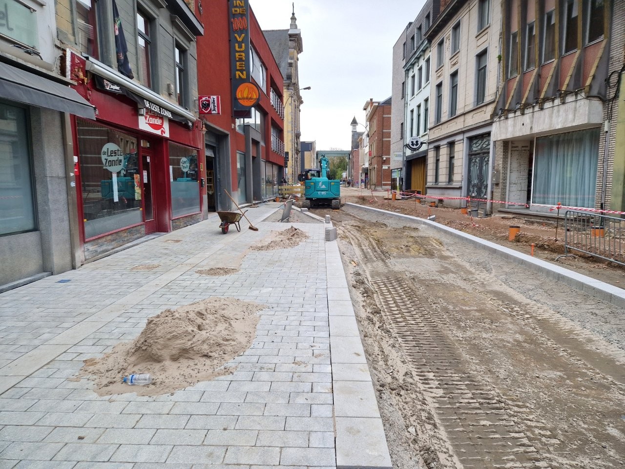 Door het begin van de aanleg van de voetpaden langs één zijde van de straat, zijn de handelszaken stilaan opnieuw vlotter bereikbaar, zonder dat de voetgangers door de modder moeten. Bijvoorbeeld aan het café De Leste Zonde, waar uitbater Peter de komende dagen een voorlopig terras plaatst tijdens het paasbouwverlof.