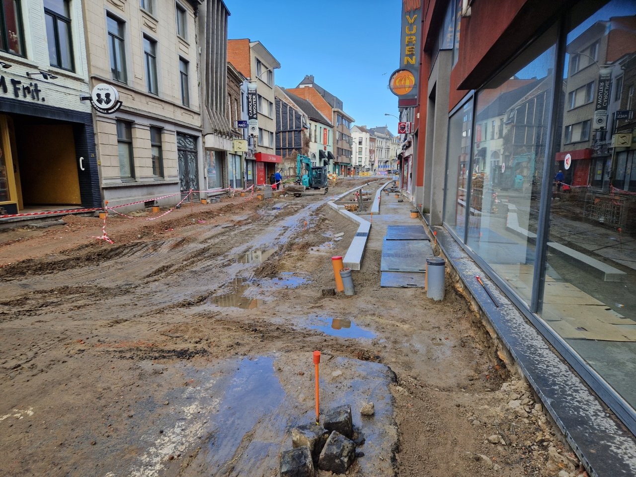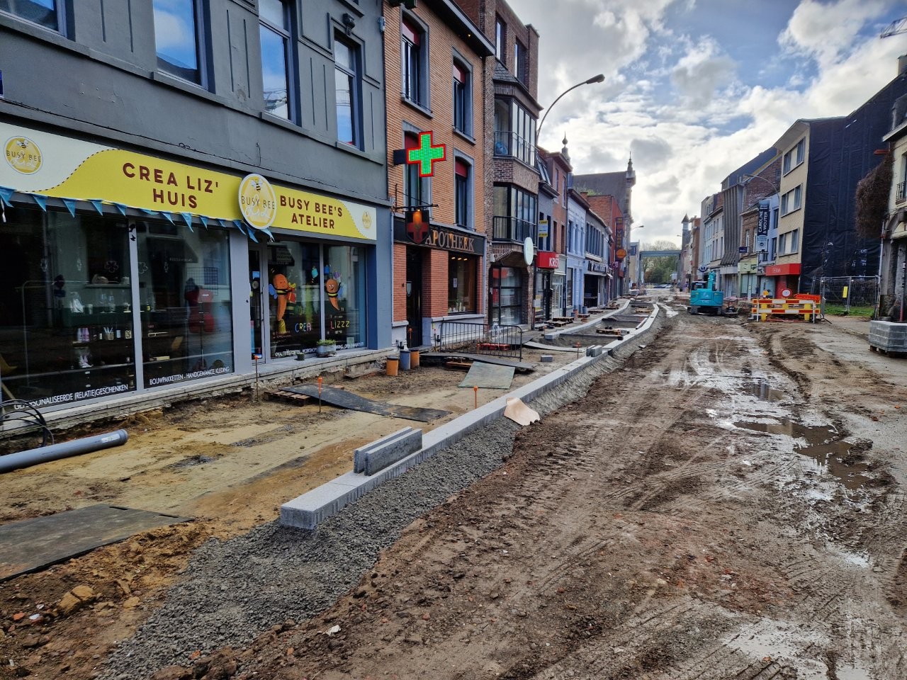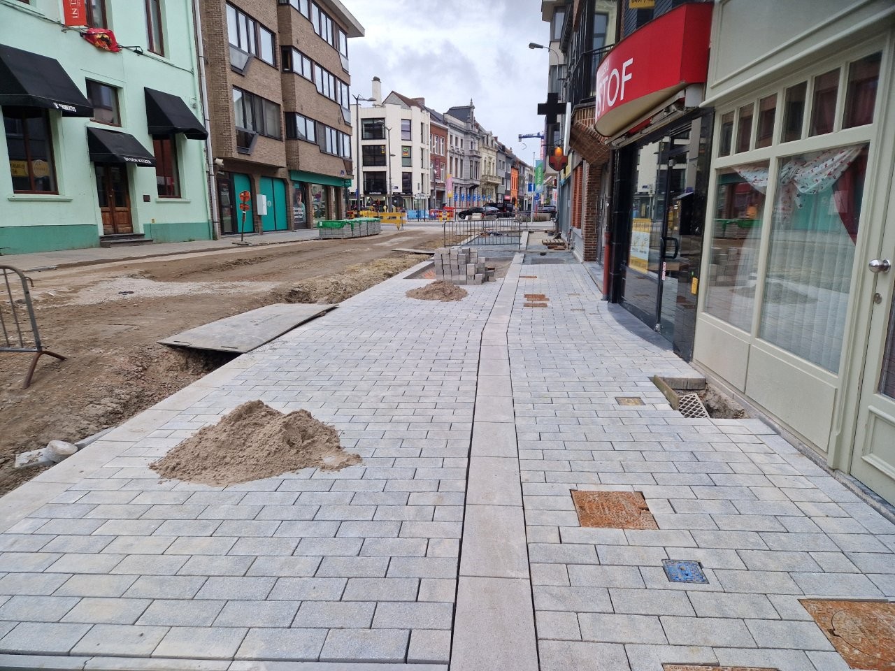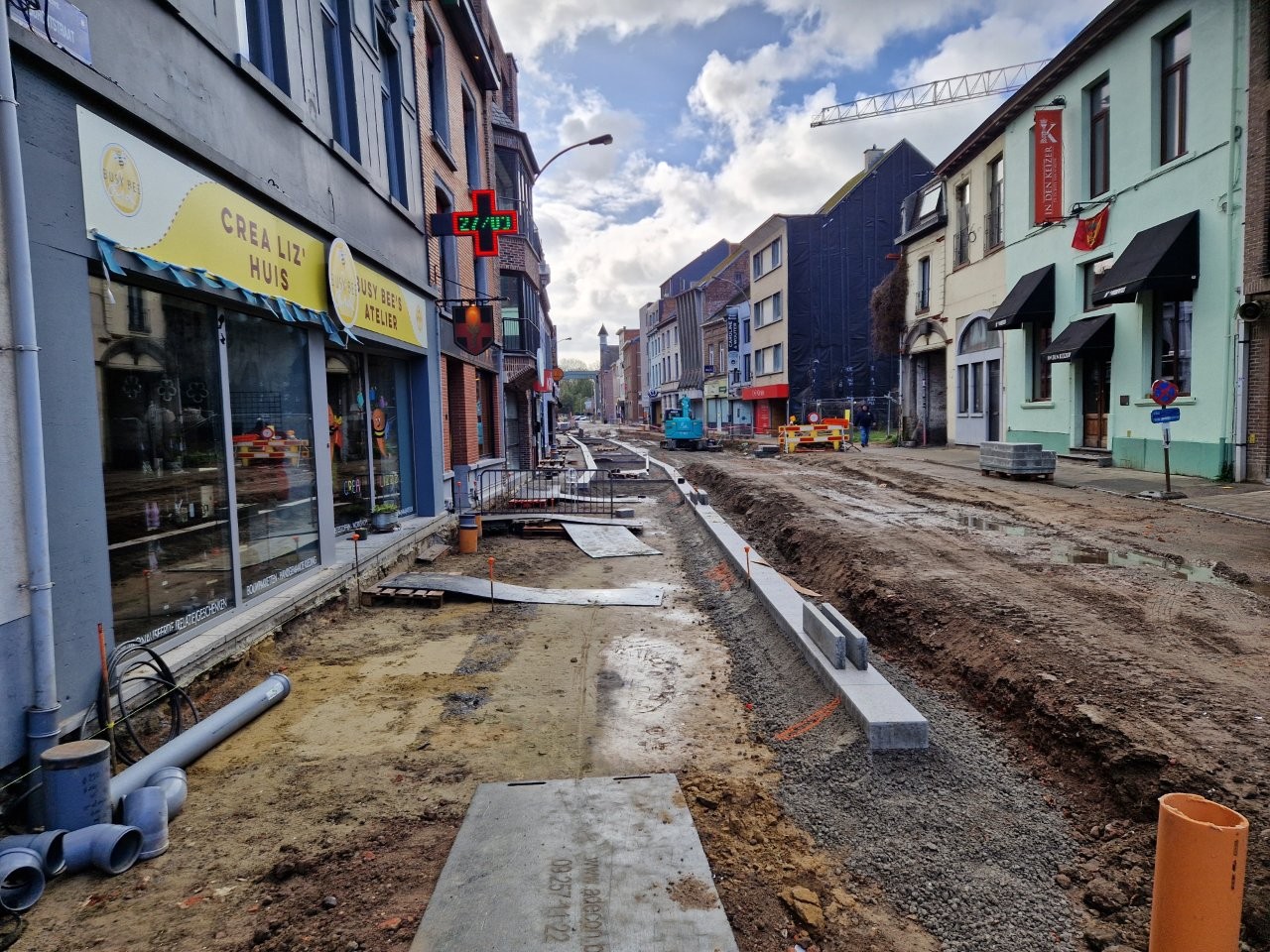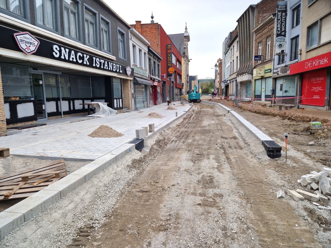 Door het begin van de aanleg van de voetpaden langs één zijde van de straat, zijn de handelszaken stilaan opnieuw vlotter bereikbaar, zonder dat de voetgangers door de modder moeten. Bijvoorbeeld aan het café De Leste Zonde, waar uitbater Peter de komende dagen een voorlopig terras plaatst tijdens het paasbouwverlof.