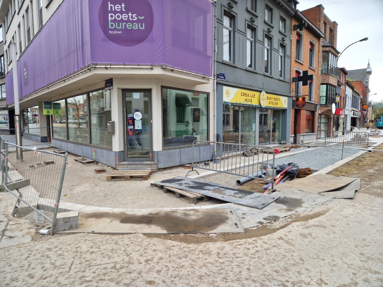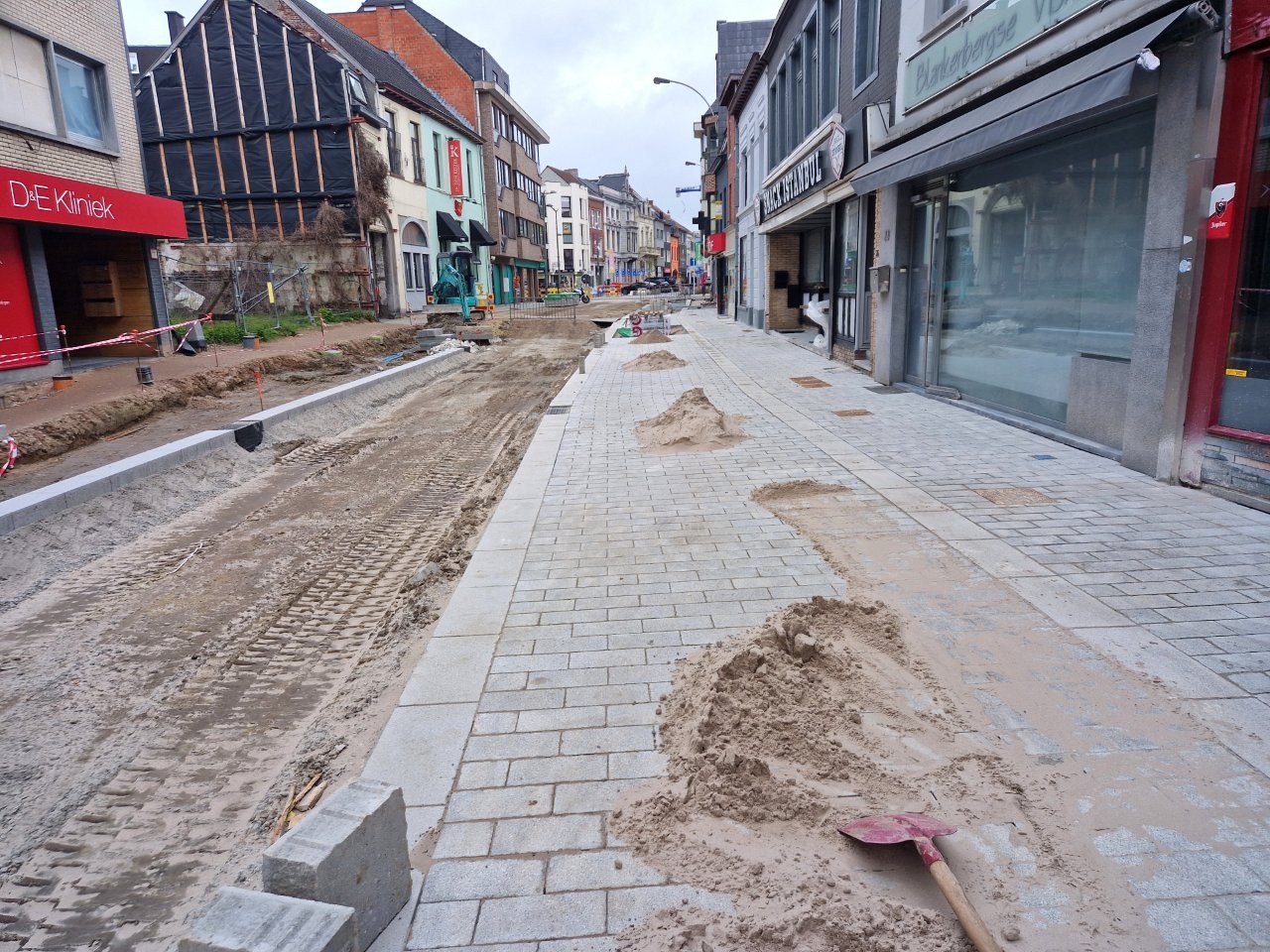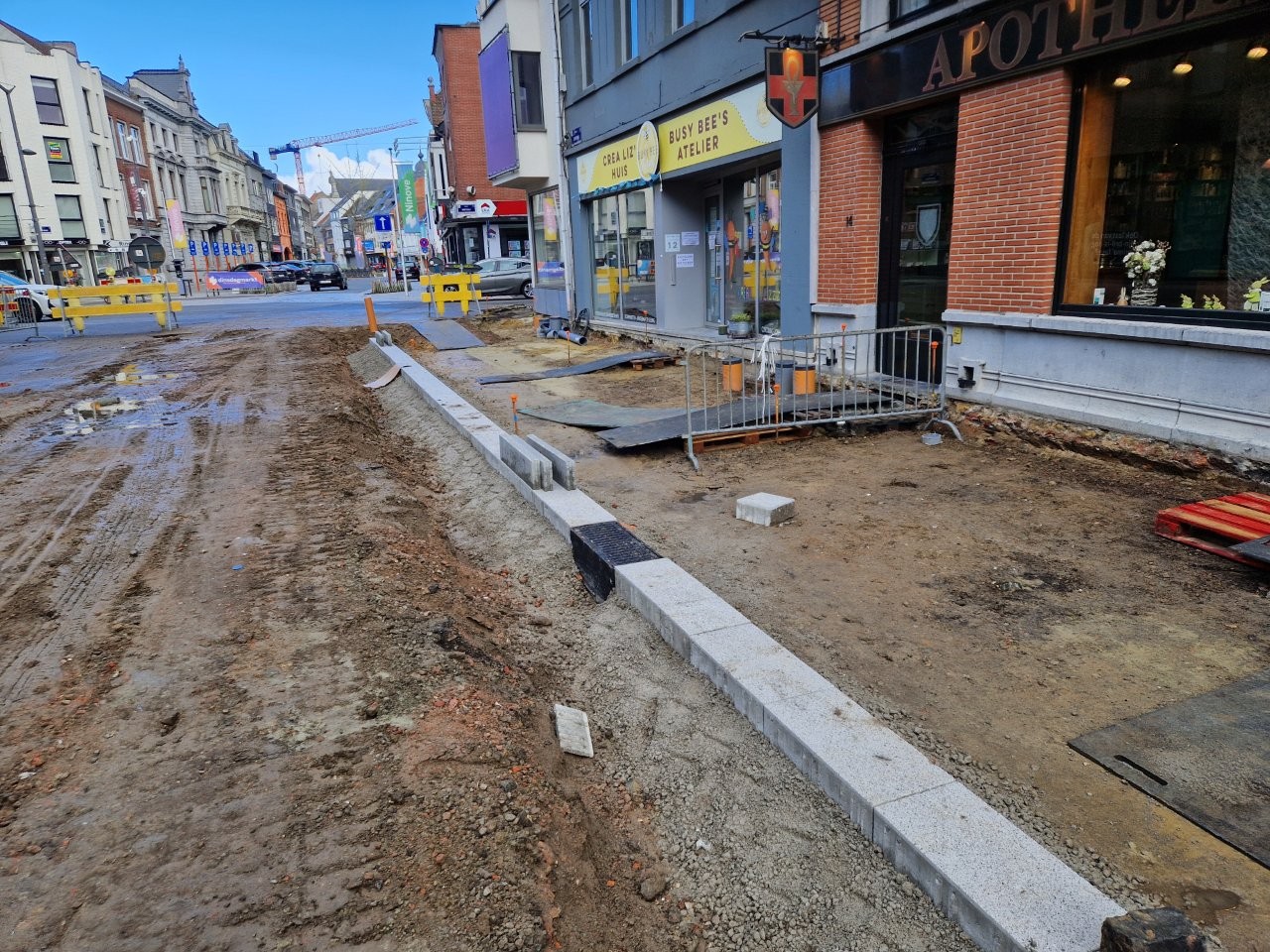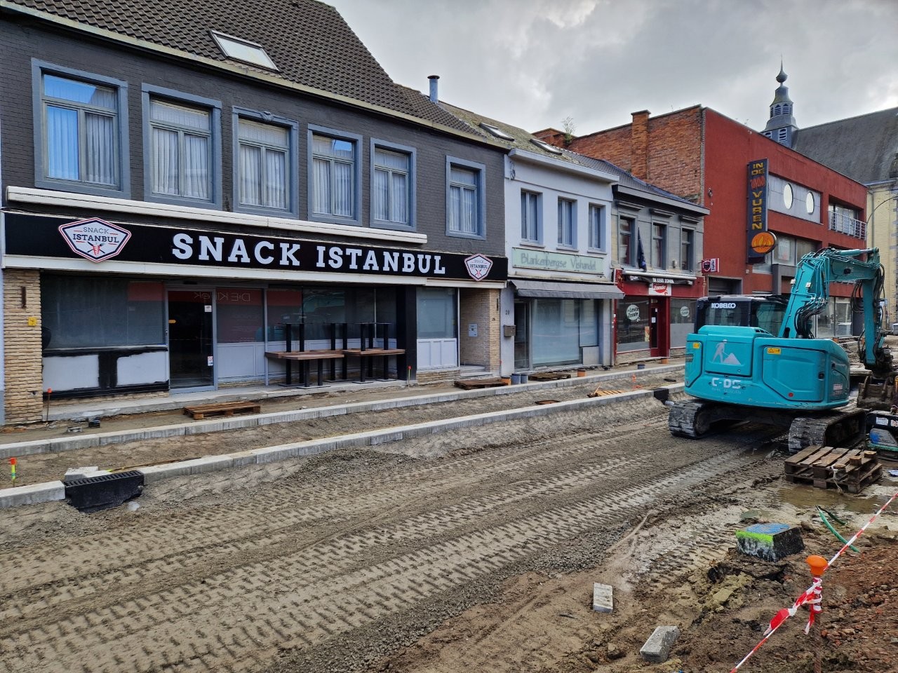 Door het begin van de aanleg van de voetpaden langs één zijde van de straat, zijn de handelszaken stilaan opnieuw vlotter bereikbaar, zonder dat de voetgangers door de modder moeten. Bijvoorbeeld aan het café De Leste Zonde, waar uitbater Peter de komende dagen een voorlopig terras plaatst tijdens het paasbouwverlof.