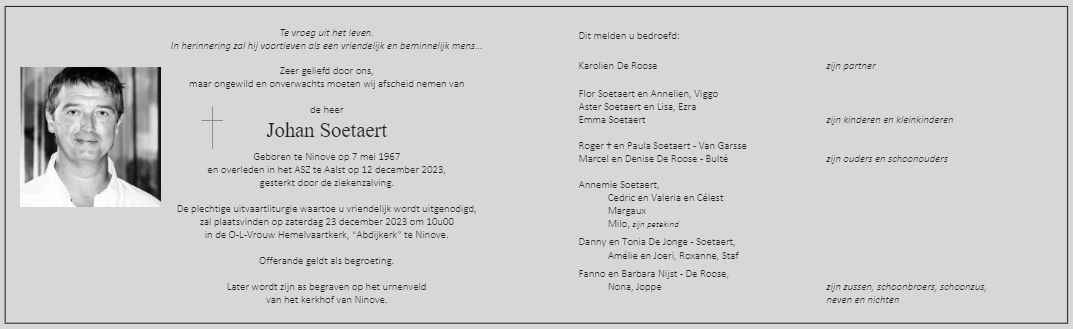 Ninove neemt afscheid van een actieve en toch rustige man. We wensen zijn vrouw Karolien en dochter Emma, zijn moeder Paula en de hele familie veel sterkte toe.