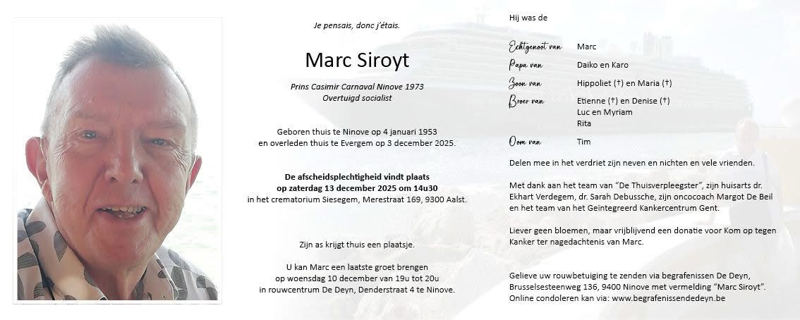 Prins Casimir was de Ninoofse stadsprins van 1973. “Hij nam ons mee op zijn eigen ‘cruiseschip van het altruïstische anarchisme’, varend op de zeven wereldzeeën van het leven. Marc Siroyt is in de loop van die 72 jaartjes op deze wereld misschien wel veranderd, maar zijn diepgevoelde intenties nooit. Zijn inzet om anderen te verheffen en zijn onvermoeibare strijd voor het rechtvaardige zijn blijvende ankers in zijn nalatenschap.”