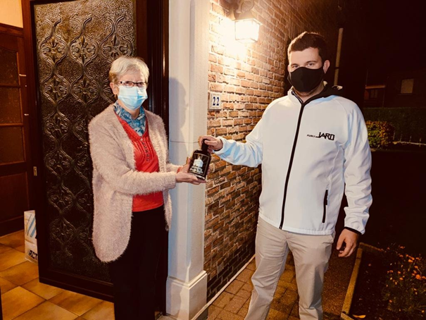 NINOVE – Jaro Goubert overhandigde een fles van zijn Nienofske Straffe Kaffee aan Patricia Van Impe. Zij deelde ons bericht op Facebook en onze onschuldige hand van dienst duidde haar aan als winnares.