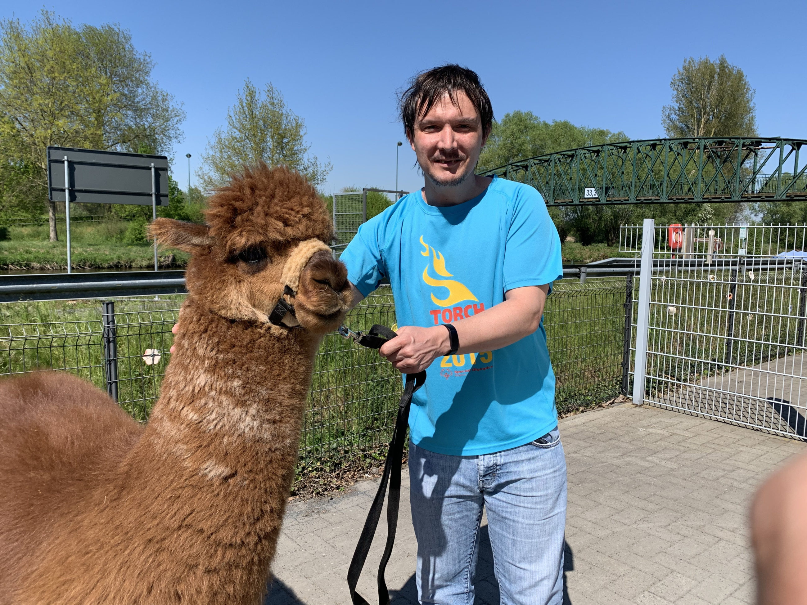 Alpaca’s zijn gekend om hun zachtaardig karakter en Dennis vormt daarop geen uitzondering. Hij is zelfs eerder aan de schuwe kant. Maar een ommetje met Pieter-Jan ziet hij duidelijk wel zitten.