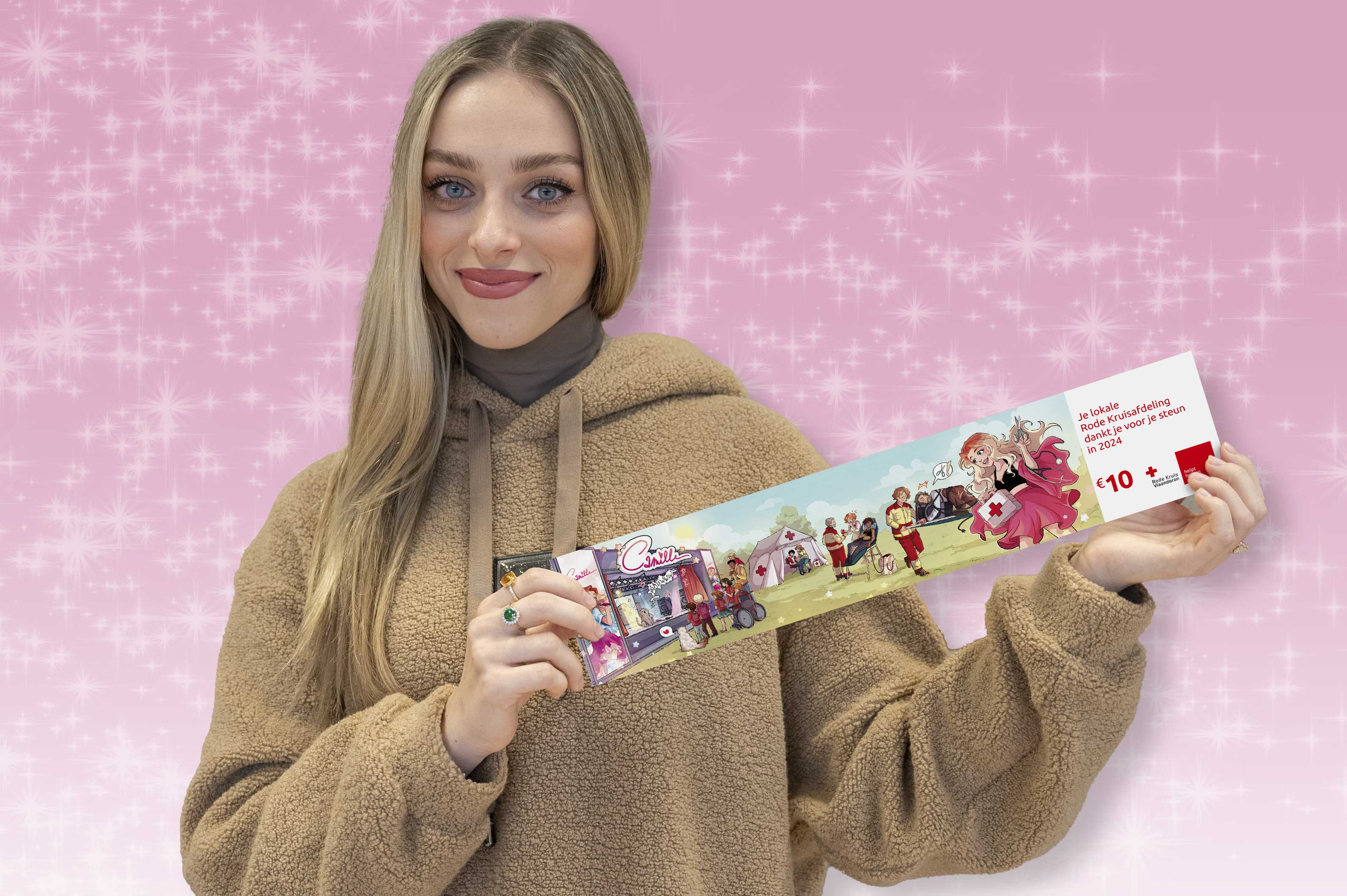 Voor de tweede keer geen stickers, maar een bruikbare pleister; dit keer met zangeres Camille als figuurtje. Op de achterkant van de pleister vind je algemene info over de activiteiten van Rode Kruis Vlaanderen, bloed en plasma, cursussen en hoe je vrijwilliger kan worden.