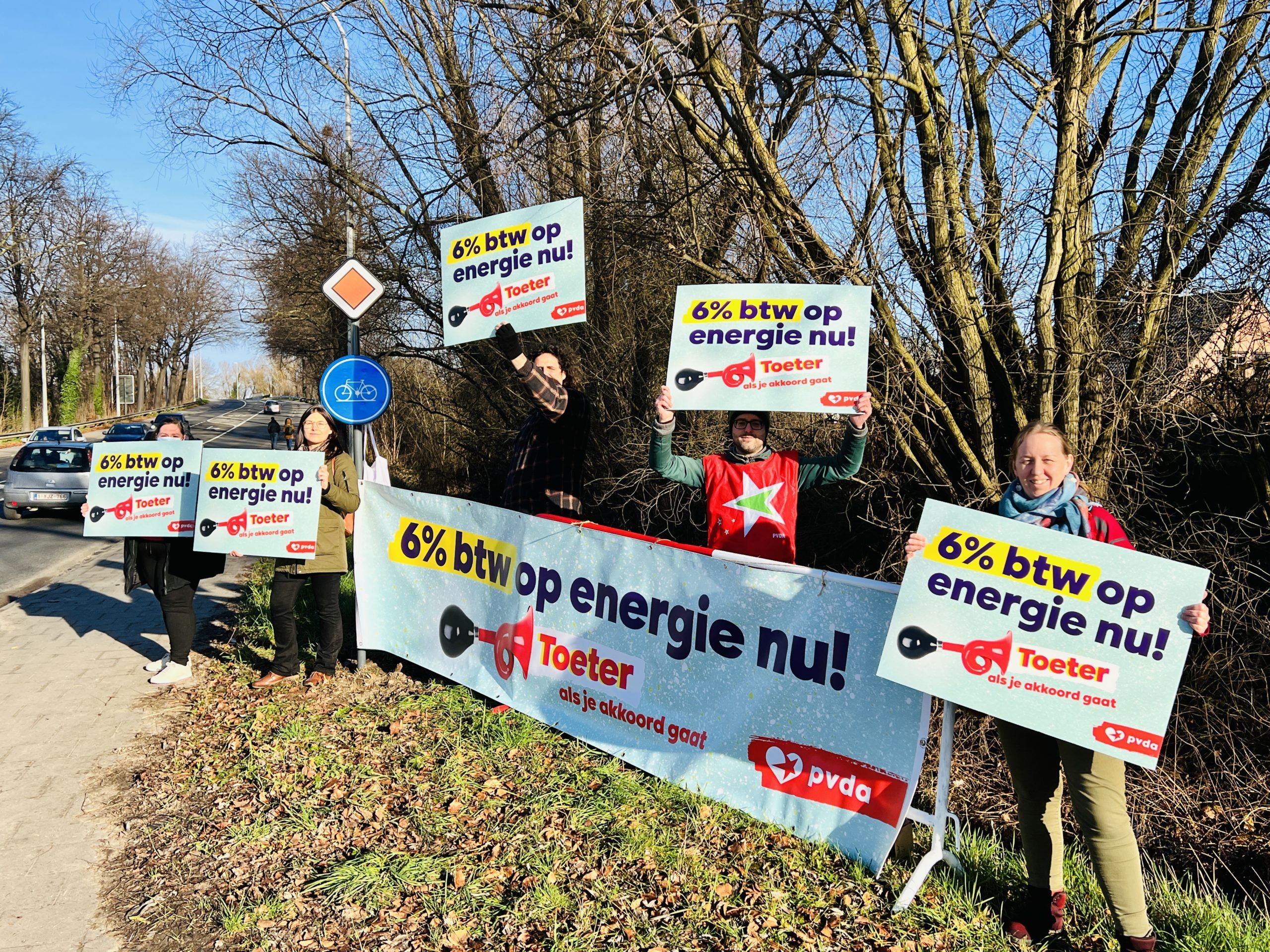 Ze riepen de voorbij rijdende chauffeurs op om te toeten als ze akkoord waren met een BTW-verlaging voor energie naar 6 %. Samuël Van Den Eeckhout (PVDA Ninove) gaf uitleg bij die actie.