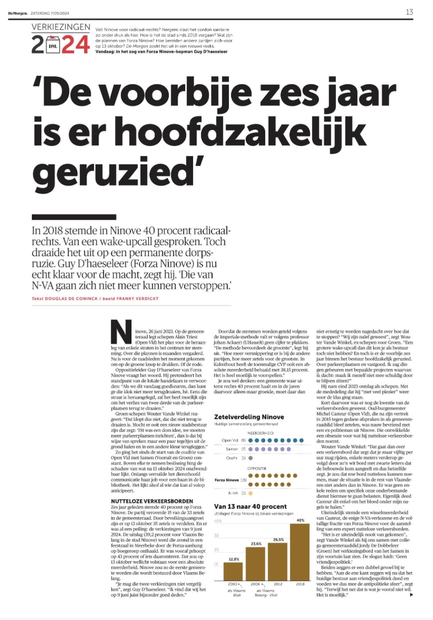 “De gewezen schepen Wouter Vande Winkel doet enkele opmerkelijke uitspraken met betrekking tot zijn ontslag als schepen. Hij stelt onder meer, en ik citeer: ‘En toch is er de voorbije zes jaar binnen het bestuur voornamelijk geruzied. Over parkeerplaatsen en vastgoed. Ik zag dingen gebeuren met bepaalde projecten waarvan ik dacht: maak ik mezelf niet schuldig door te blijven zitten?’ Dat bewijst, dat die anti-Forza-coalitie 6 jaar lang niet heeft gewerkt en de voorgaande 6 jaar evenmin.”