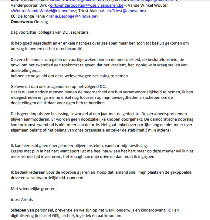 De bewuste mail, waarin schepen Joost Arents (Onafh.) ontslag neemt uit het directiecomité van De Kleine Dender.