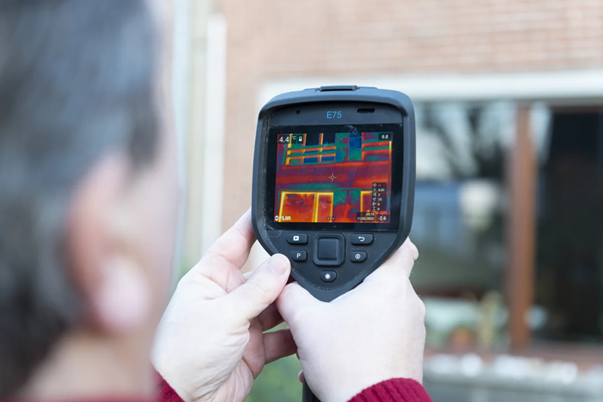 Een speciale thermografische camera maakt beelden van de voorgevel. Door het temperatuurverschil van de gevel met de omgeving worden koudebruggen en warmtelekken van de woning in kaart gebracht. Samen met een foto van de woning geeft dit een duidelijk beeld van de exacte plaatsen, waar de woning warmte verliest.