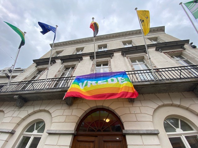 Aan het stadhuis, het Sociaal Huis en het Oud Stadhuis hangt de regenboogvlag als teken van solidariteit met de LGBTQI+-gemeenschap.