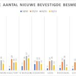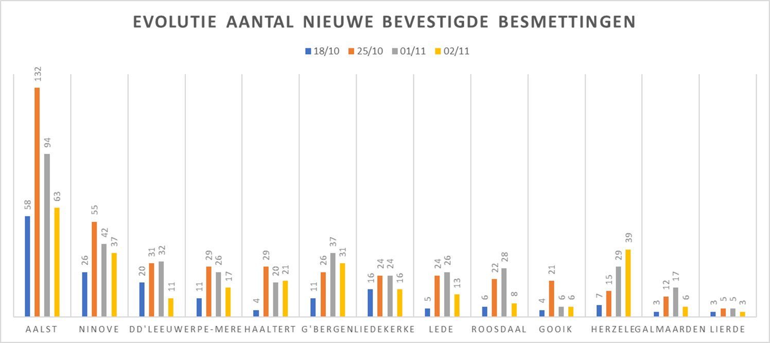 In 11 van de steden en gemeenten, die we sinds het begin van de crisis volgen, is het aantal vastgestelde besmettingen gedaald. Enkel in Herzele (+ 10) en Haaltert (+1) was er nog een toename.
