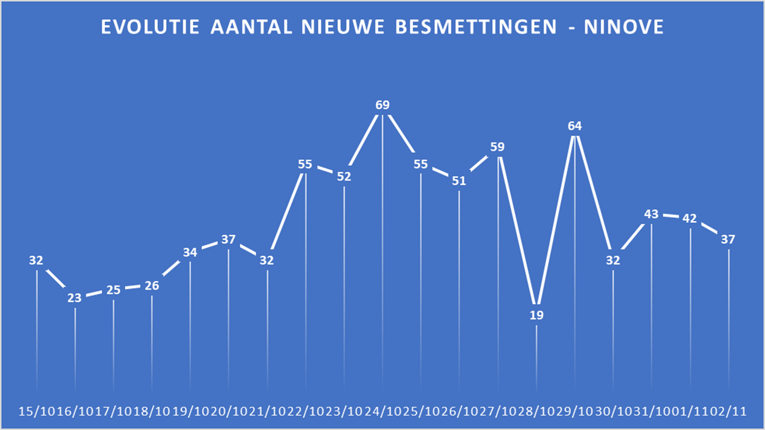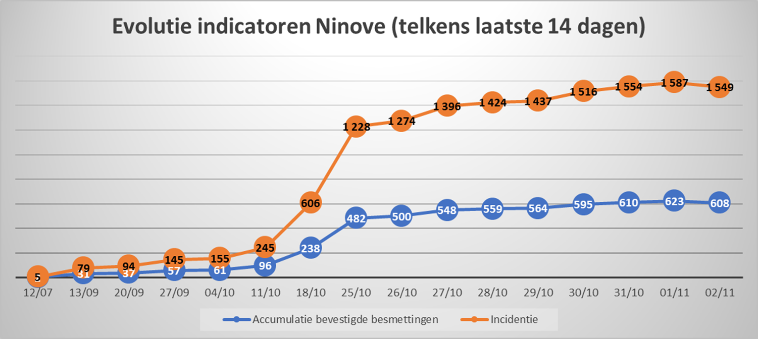 In totaal zijn in Ninove 1.286 besmettingen genoteerd sinds het begin van de telling. Op 02 november zijn er 37 bevestigde besmettingen bijgekomen.