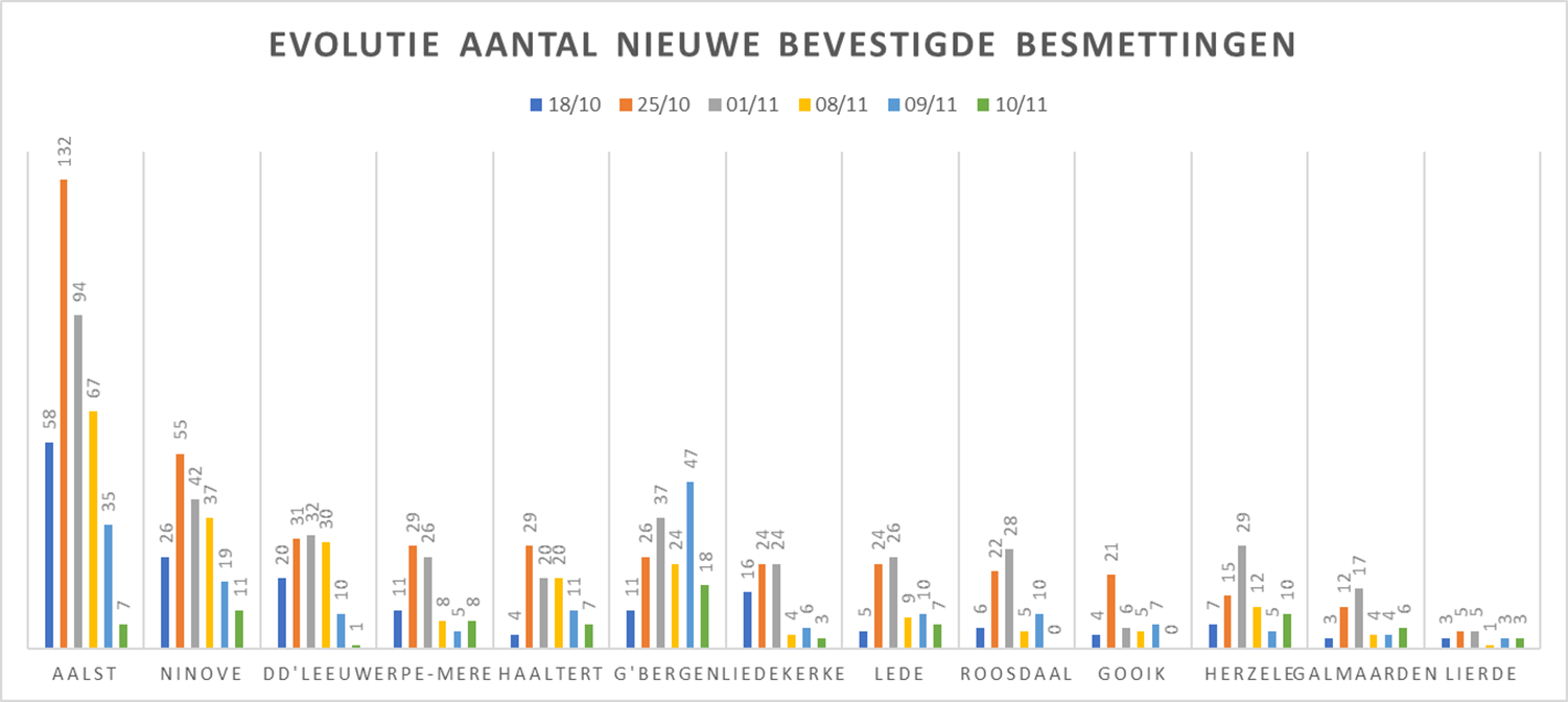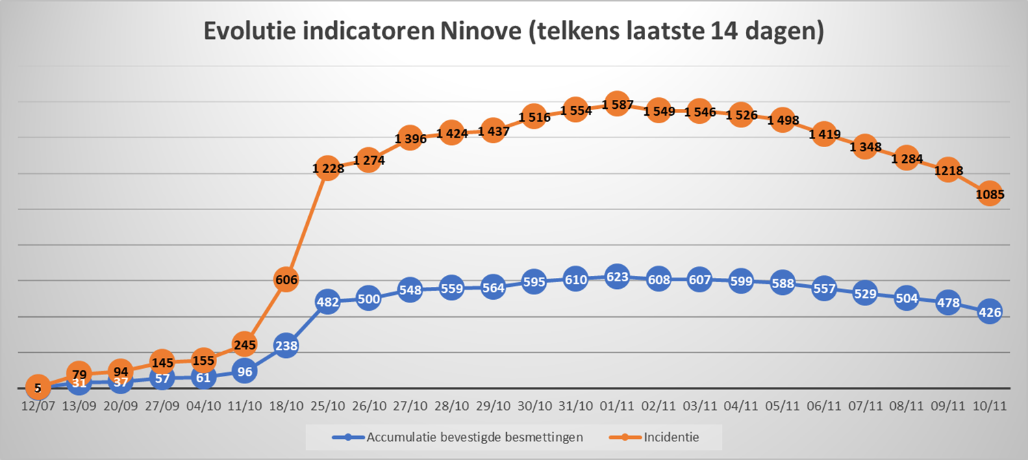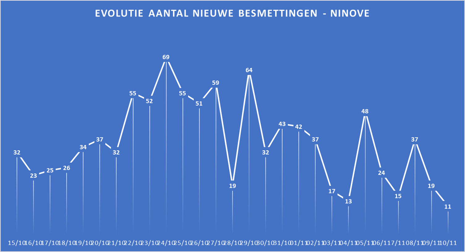 NINOVE – Volgens Sciensano zijn de afgelopen 14 dagen 426 bevestigde besmettingen genoteerd in Ninove. Dit is een daling, die in de lijn ligt van de globale afname.