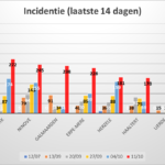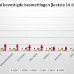 Hieronder een tabel met het aantal bevestigde besmettingen van de afgelopen 14 dagen (12 juli als referentie). Deze en de andere gegevens zetten we in grafieken (bijlagen).