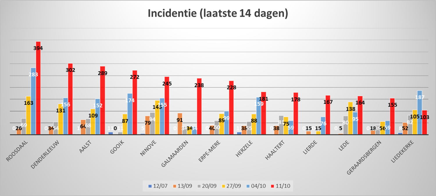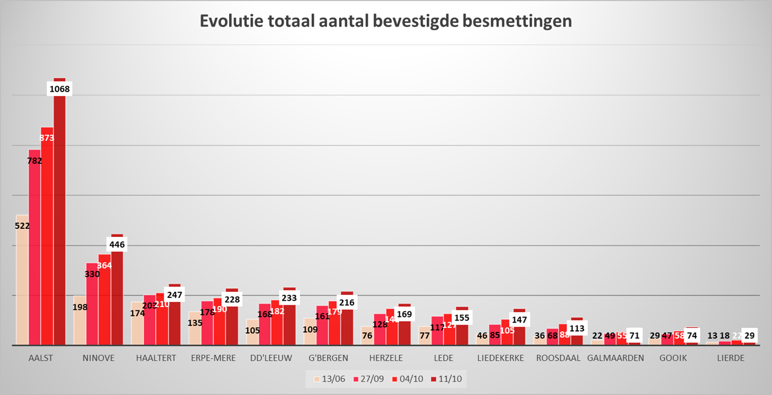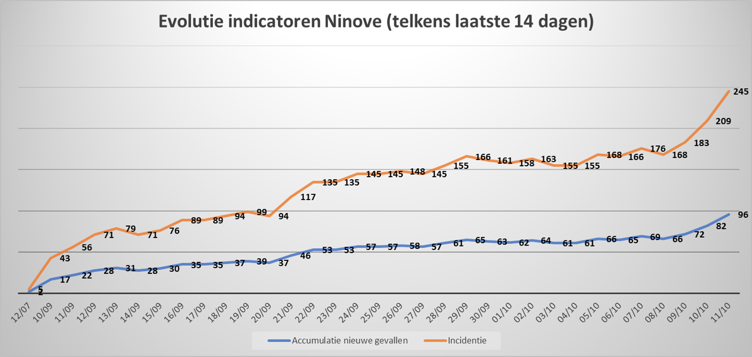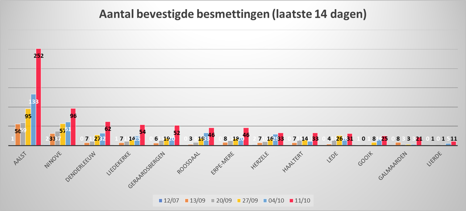 NINOVE – Volgens Sciensano zijn de afgelopen 14 dagen 96 bevestigde besmettingen genoteerd in Ninove. We brengen deze en andere cijfers van de omliggende steden en gemeenten elke week in kaart.