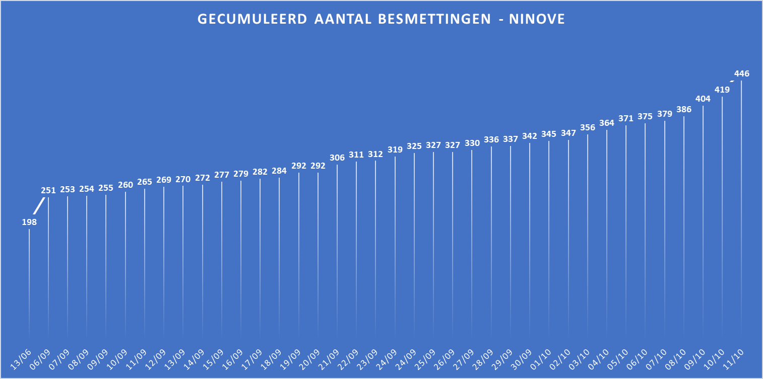 - In totaal zijn in Ninove 446 besmettingen genoteerd sinds het begin van de telling.