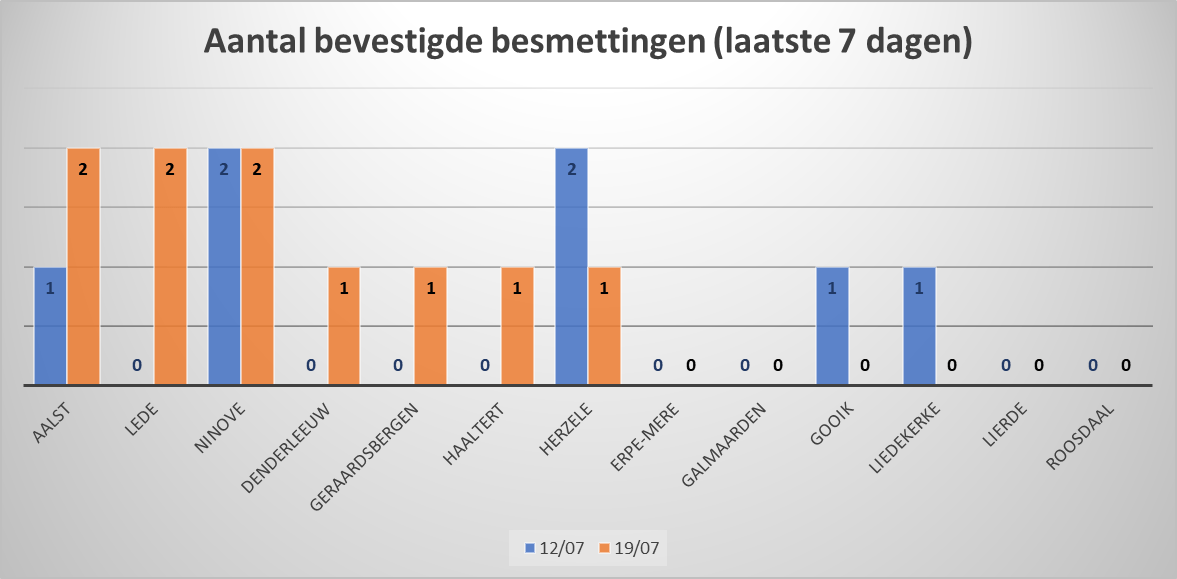 NINOVE – Volgens Sciensano zijn de afgelopen 7 dagen 2 bevestigde besmettingen genoteerd in Ninove. We brengen deze en andere cijfers van de omliggende steden en gemeenten elke week in kaart.