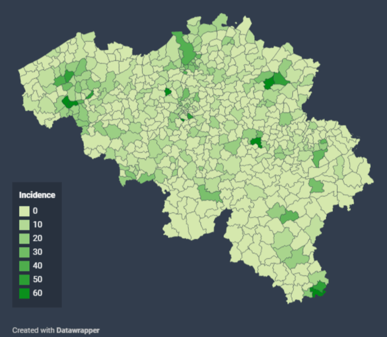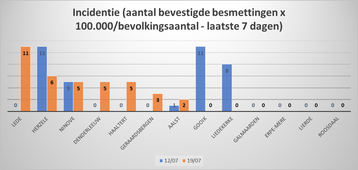 – de incidentie (aantal bevestigde besmettingen x 100.000/bevolkingsaantal – laatste 7 dagen),
