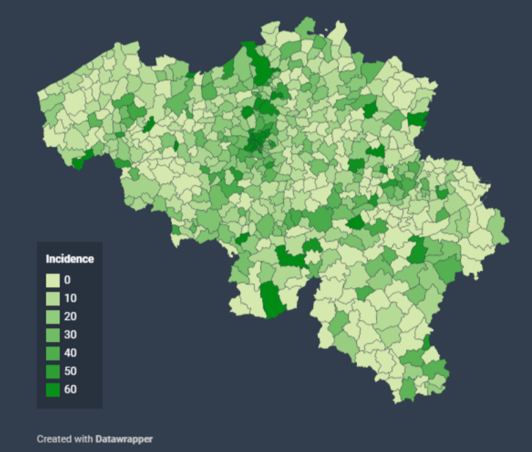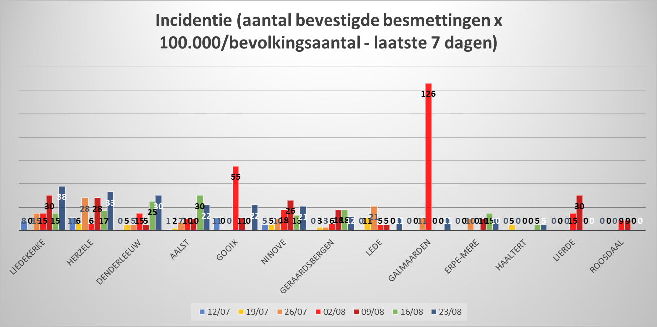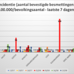 – de incidentie (aantal bevestigde besmettingen x 100.000/bevolkingsaantal – laatste 7 dagen),