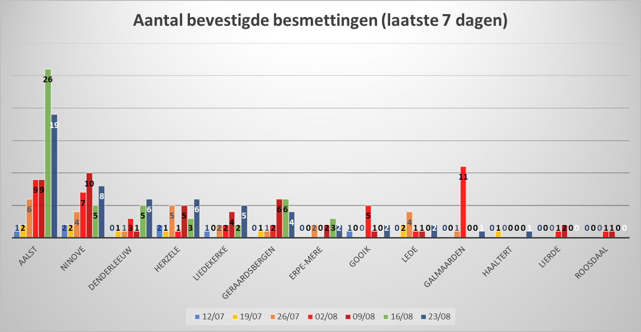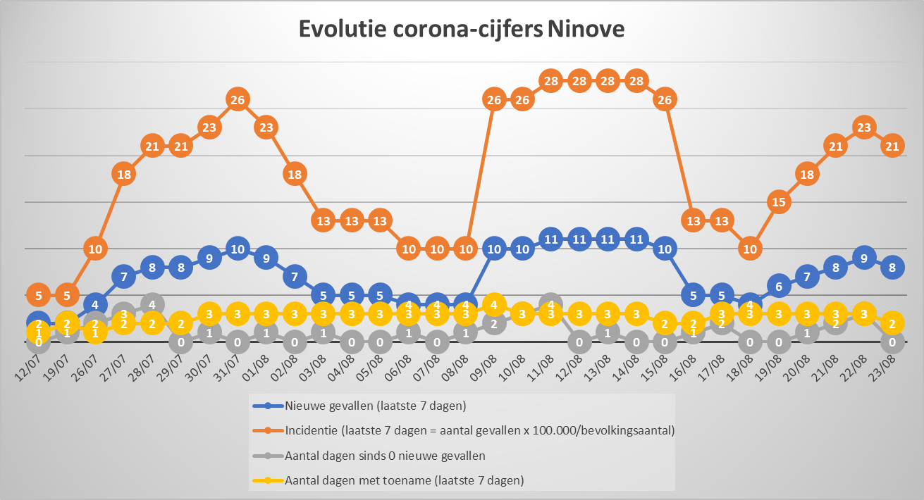 NINOVE – Volgens Sciensano zijn de afgelopen 7 dagen 8 bevestigde besmettingen genoteerd in Ninove. We brengen deze en andere cijfers van de omliggende steden en gemeenten elke week in kaart.