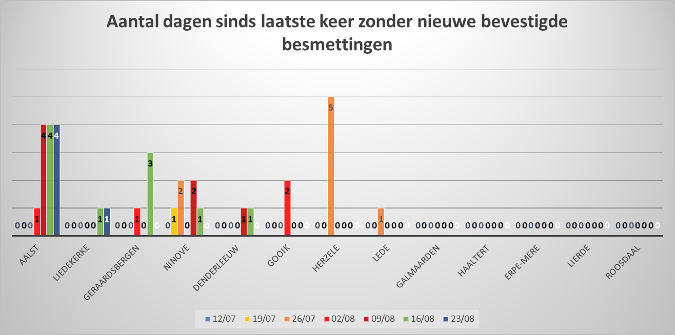 – het aantal dagen sinds er geen nieuwe bevestigde besmettingen zijn,