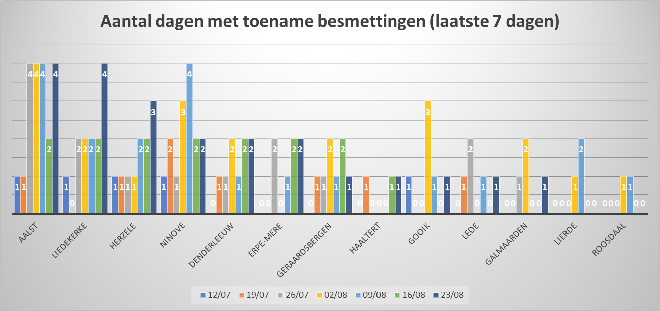 – het aantal bevestigde besmettingen (laatste 7 dagen),