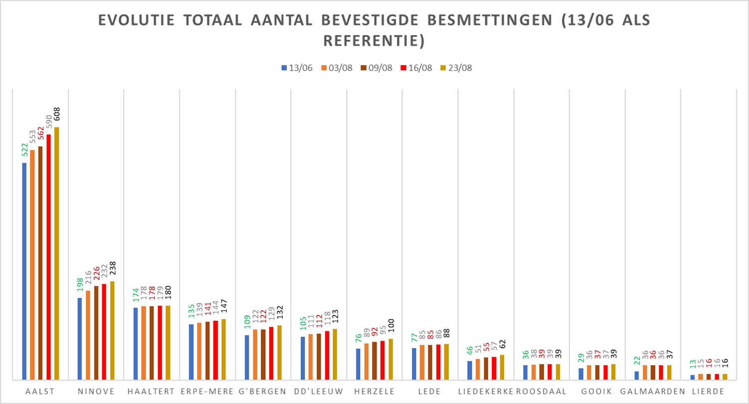 In totaal zijn in Ninove 238 besmettingen genoteerd sinds het begin van de telling.