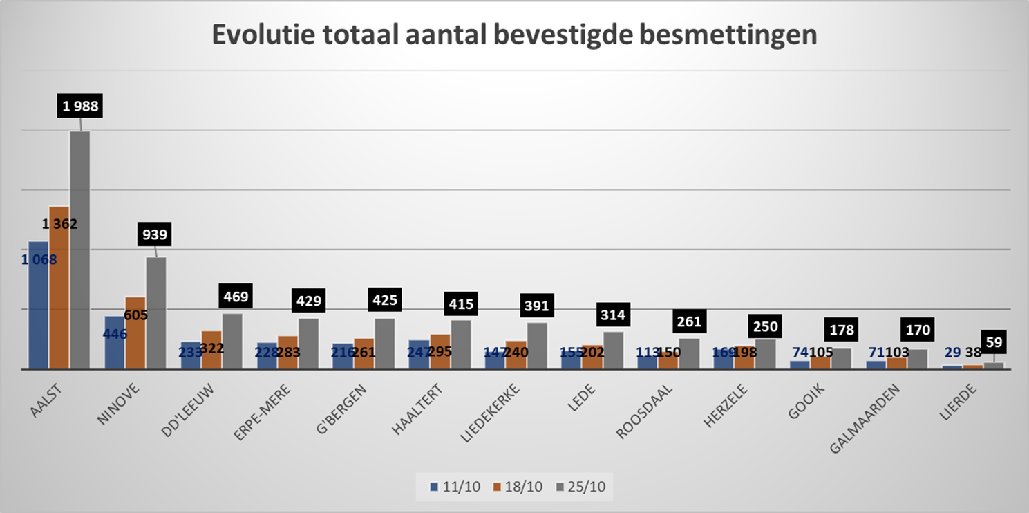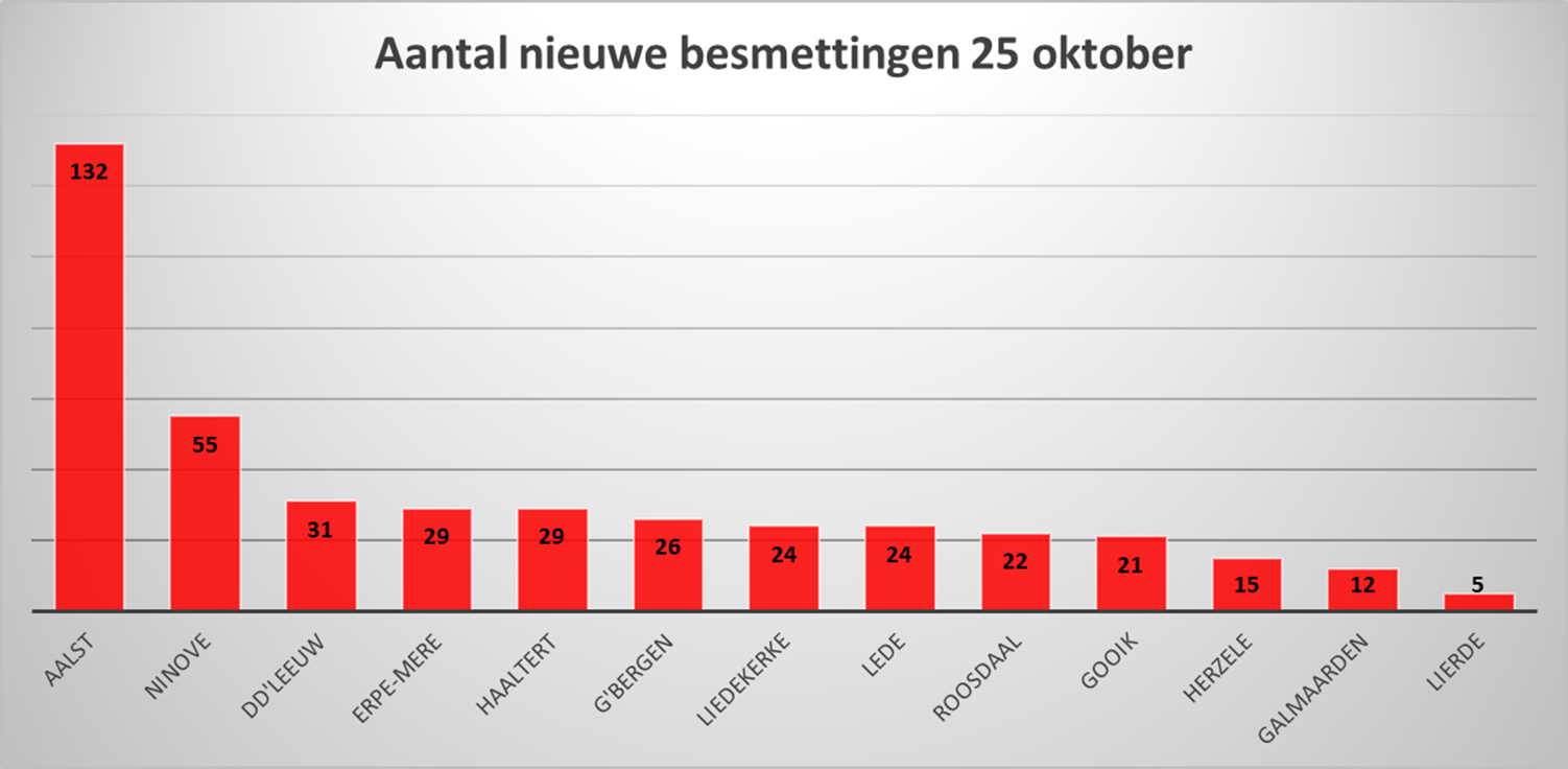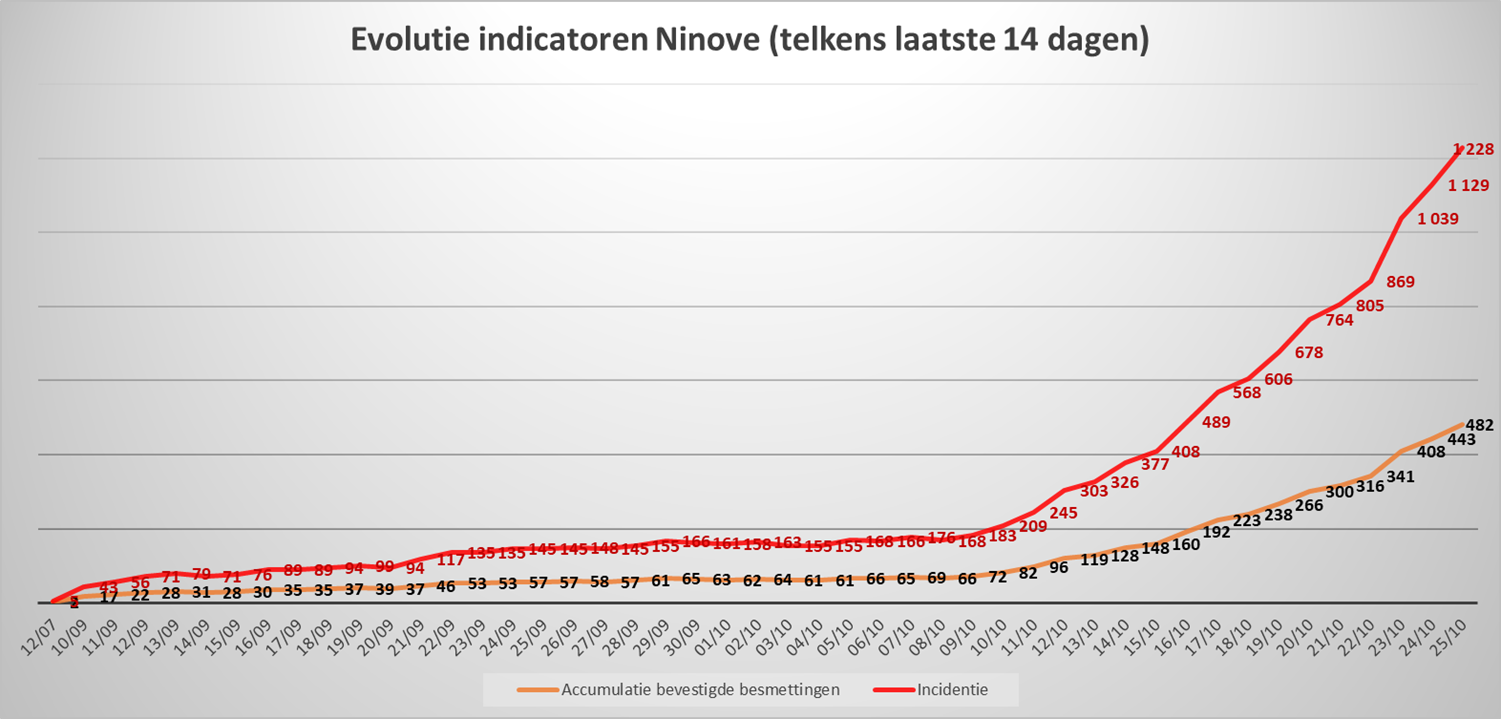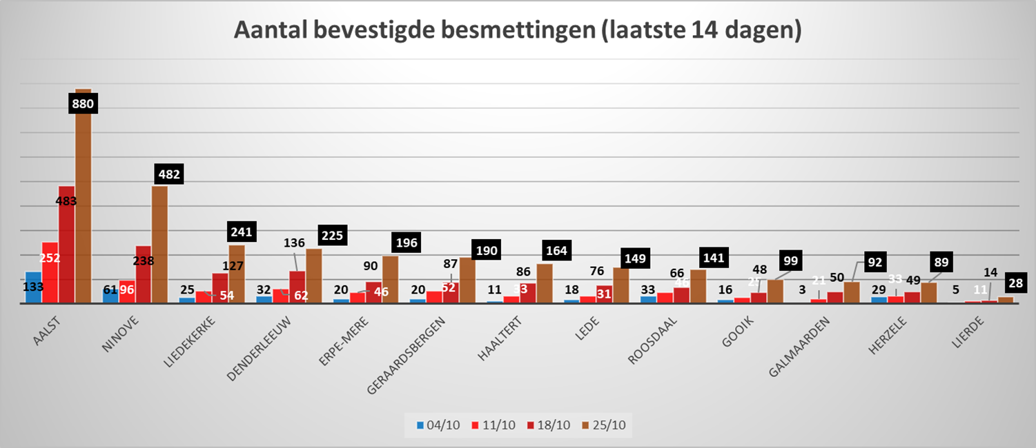 NINOVE – Volgens Sciensano zijn de afgelopen 14 dagen 482 bevestigde besmettingen genoteerd in Ninove. We brengen deze en andere cijfers van de omliggende steden en gemeenten elke week in kaart.