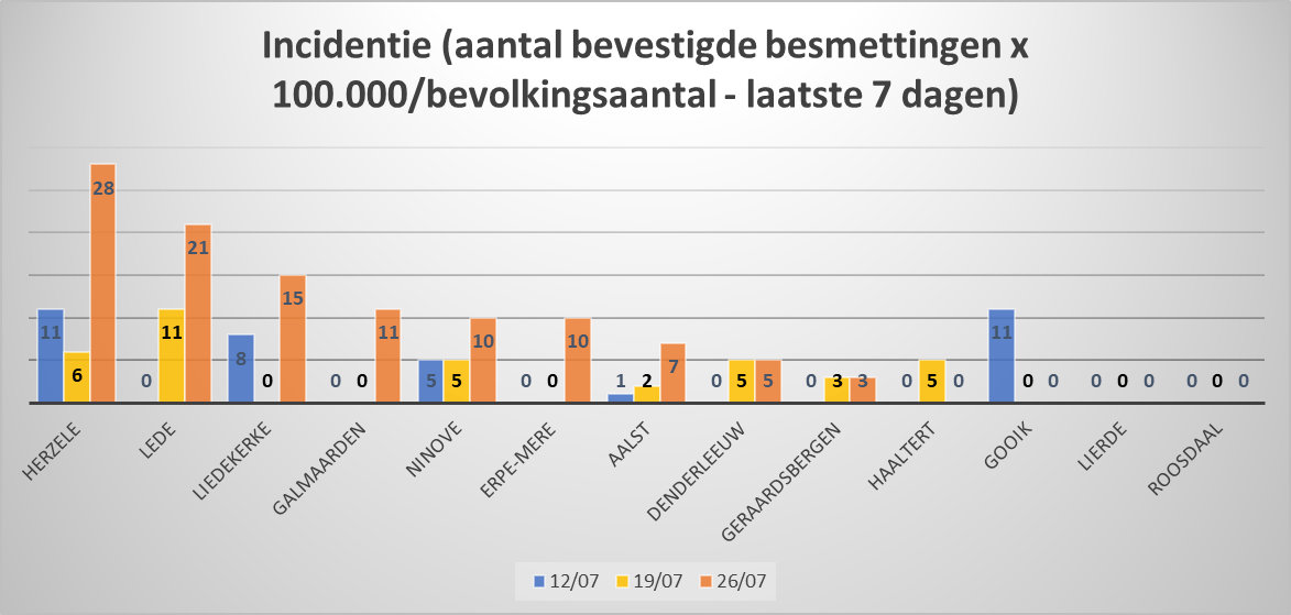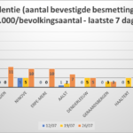 - de incidentie (aantal bevestigde besmettingen x 100.000/bevolkingsaantal – laatste 7 dagen),