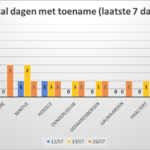 Hieronder een tabel met het aantal bevestigde besmettingen per week, vanaf 12 juli. Deze en de andere gegevens zetten we in grafieken (bijlagen).