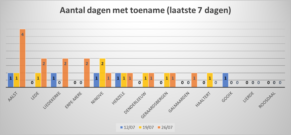 | Gemeente/Stad | 12/07 | 19/07 | 26/07 | 02/08 | 09/08 | 16/08 |