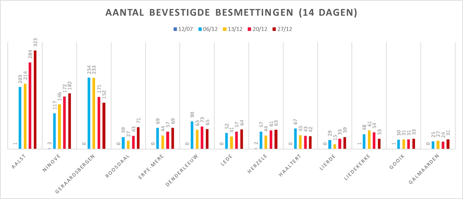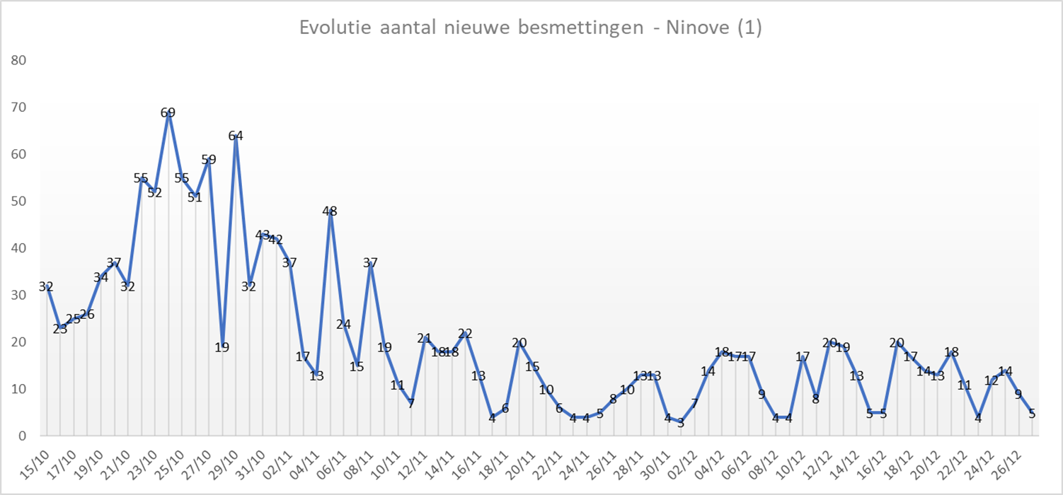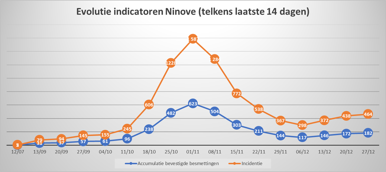 NINOVE – Volgens Sciensano zijn de afgelopen 14 dagen 182 bevestigde besmettingen genoteerd in Ninove. We brengen deze en andere cijfers van de omliggende steden en gemeenten elke week in kaart.