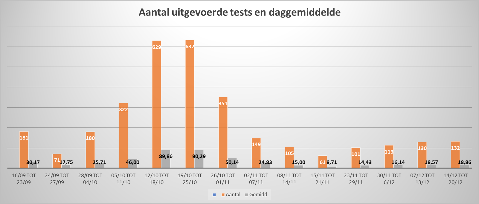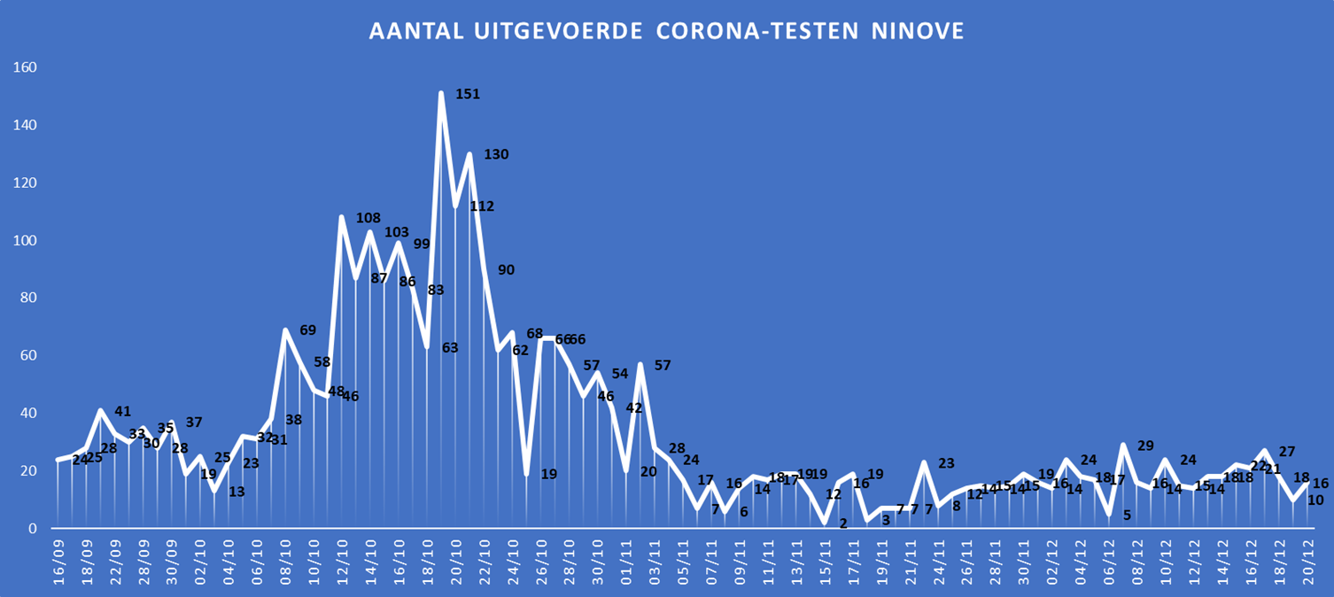 - In het testcentrum van Ninove zijn tot en met 20 december 3.170 mensen getest. Daarin zijn niet de wekelijkse testen in het WZC Klateringen begrepen.