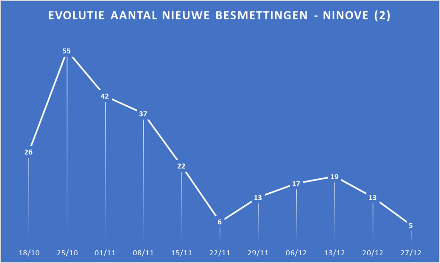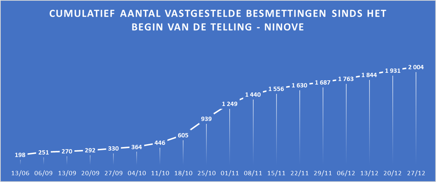 - In totaal zijn in Ninove 2.004 besmettingen genoteerd sinds het begin van de telling.