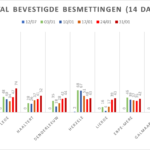 Hieronder een tabel met het aantal bevestigde besmettingen van de afgelopen 14 dagen (12 juli als referentie). Deze en de andere gegevens zetten we in grafieken (bijlagen).