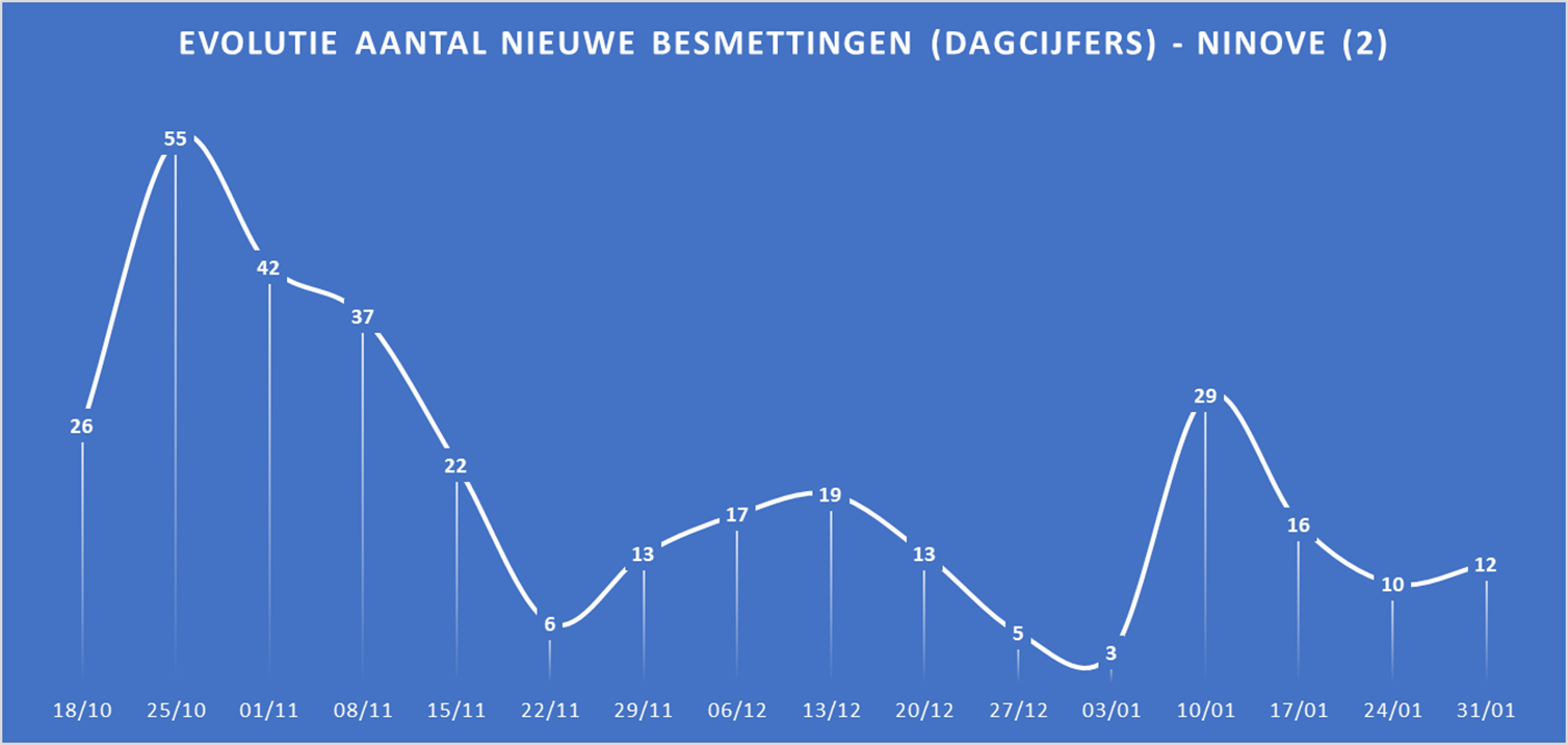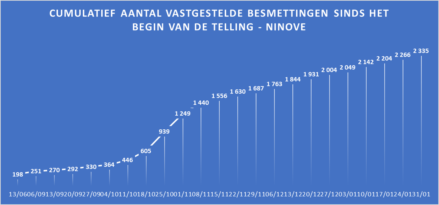 - In totaal zijn in Ninove 2.335 besmettingen genoteerd sinds het begin van de telling in 2020.
