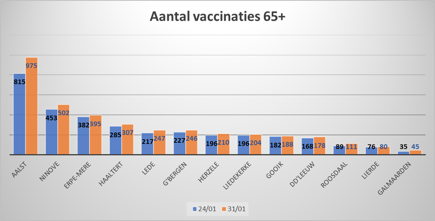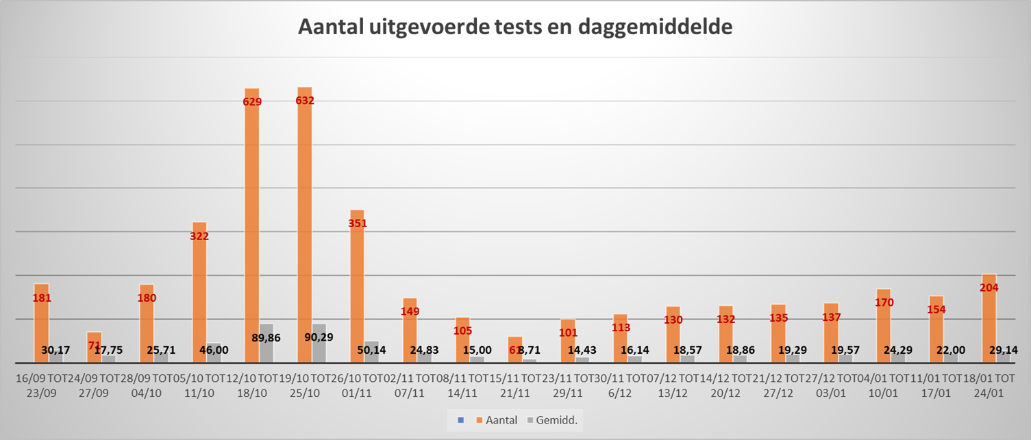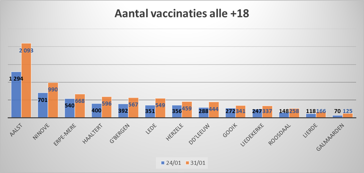 Daarin zijn niet de wekelijkse testen in het WZC Klateringen begrepen. - Op 31 januari zijn 990 van alle +18-jarigen gevaccineerd, waarvan 502 in de leeftijdsgroep 65+.