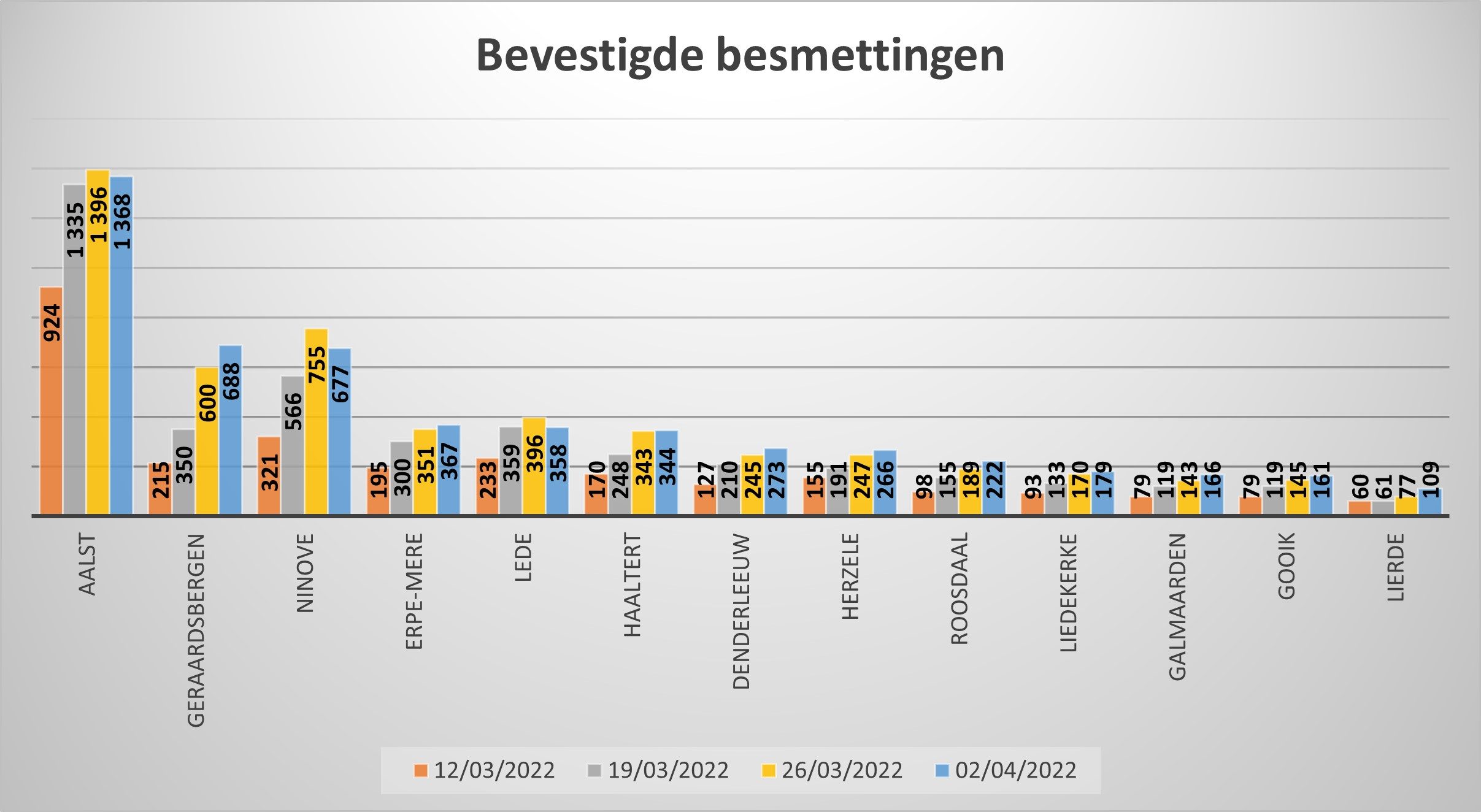 | Gemeente/Stad | 5/03/2022 | 12/03/2022 | 19/03/2022 | 26/03/2022 | 02/04/2022 |