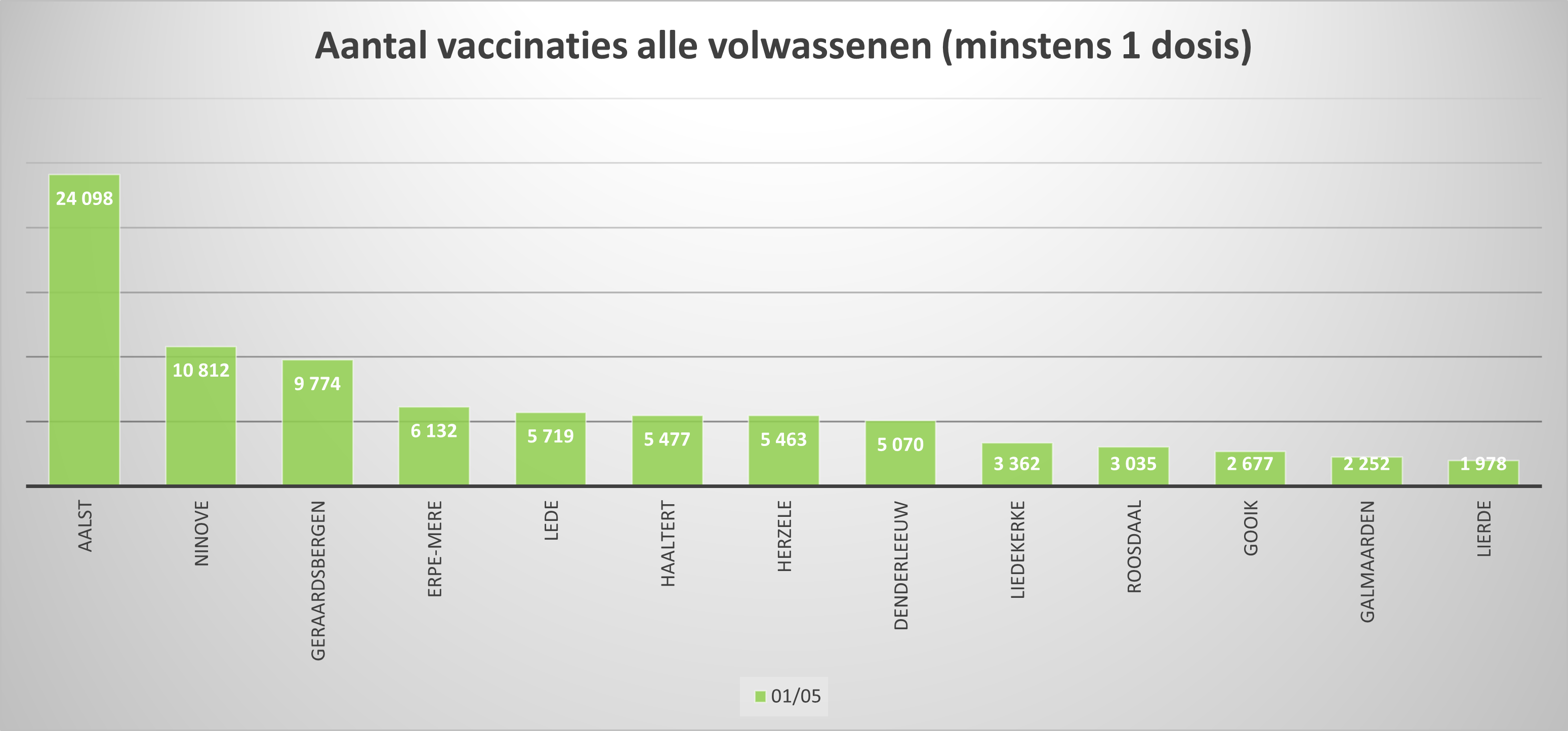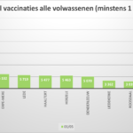 - Tot 01 mei kregen 10.812 van alle +18-jarigen minstens 1 vaccinatieprik. Dat is 34,46 % van die bevolkingsgroep. 2.521 (8,03 %) van de volwassenen zijn volledig gevaccineerd.