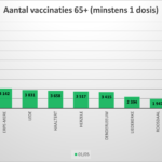 - 7.635 vaccins zijn toegediend in de leeftijdsgroep 65+ (ook minstens 1 prik), goed voor 93,83 %. Van die groep zijn 1.016 personen (12,49 %) volledig gevaccineerd.