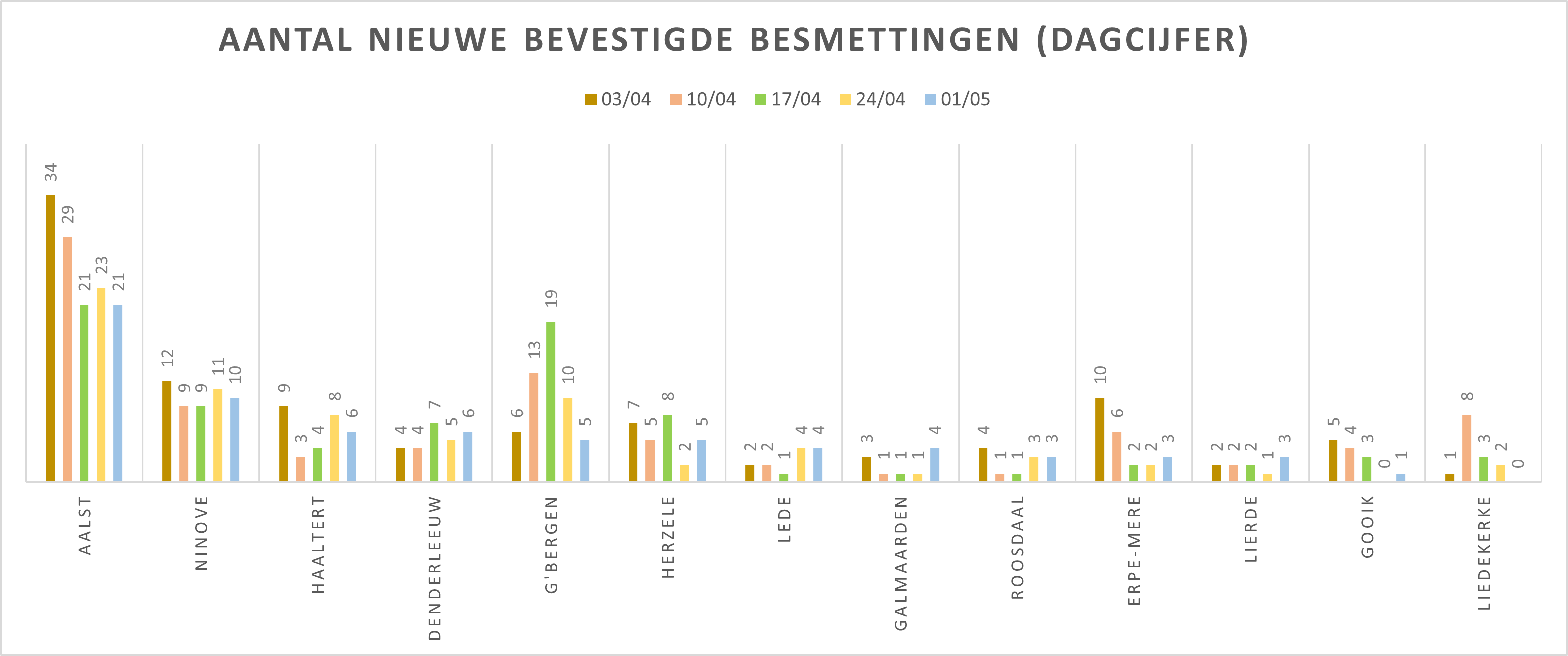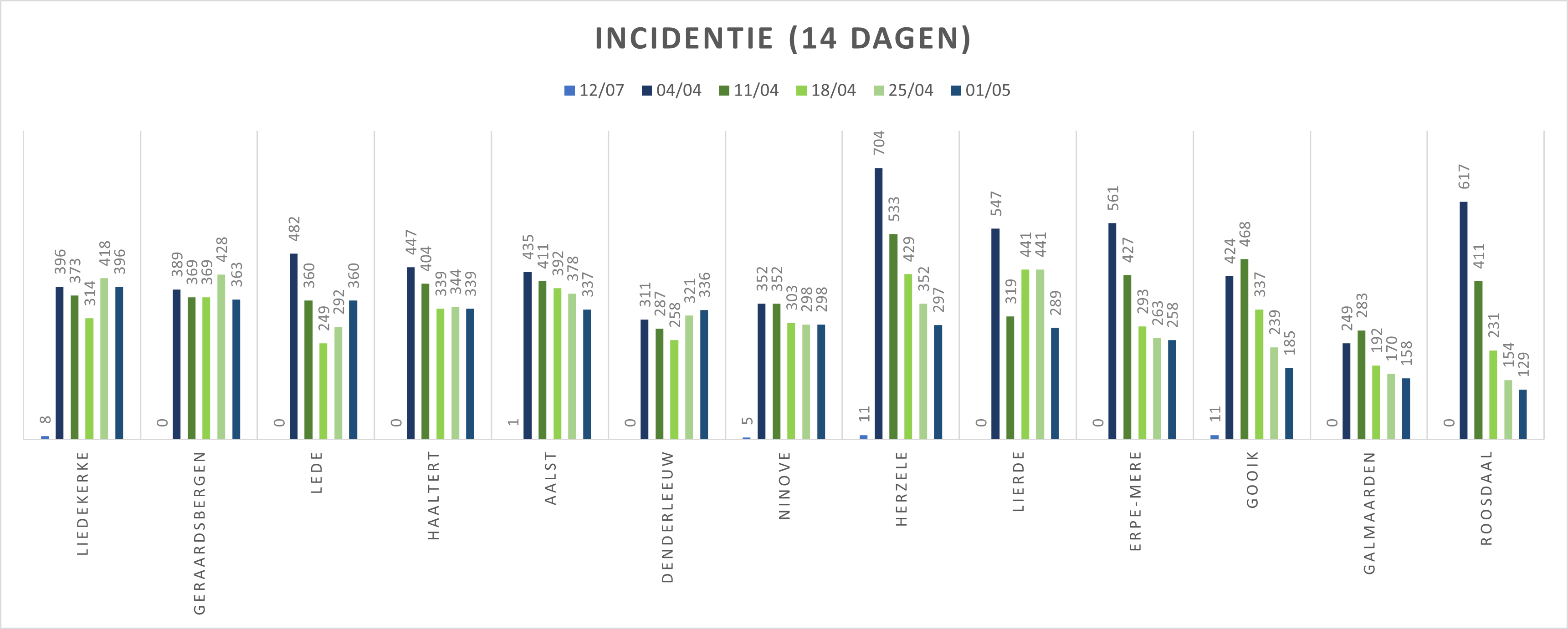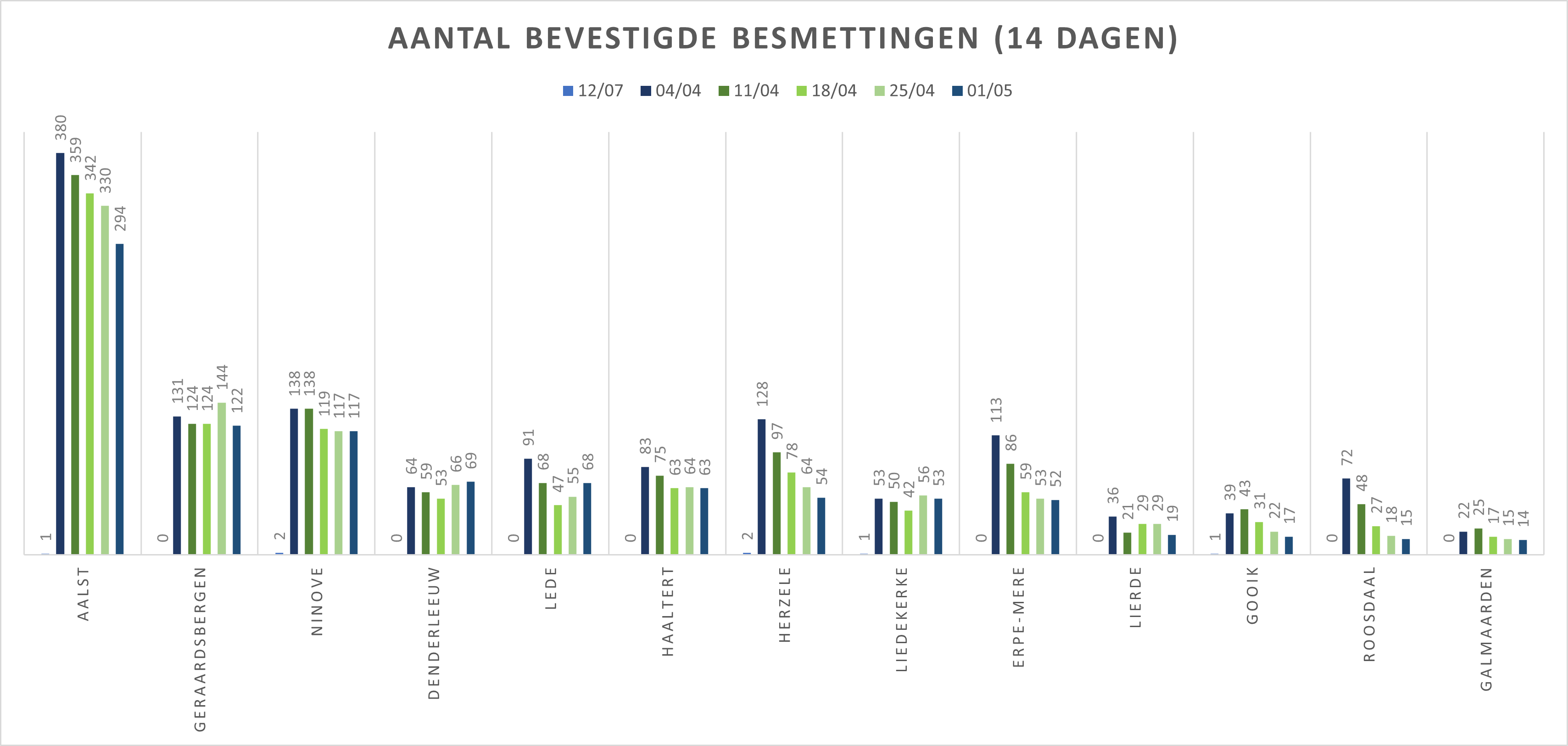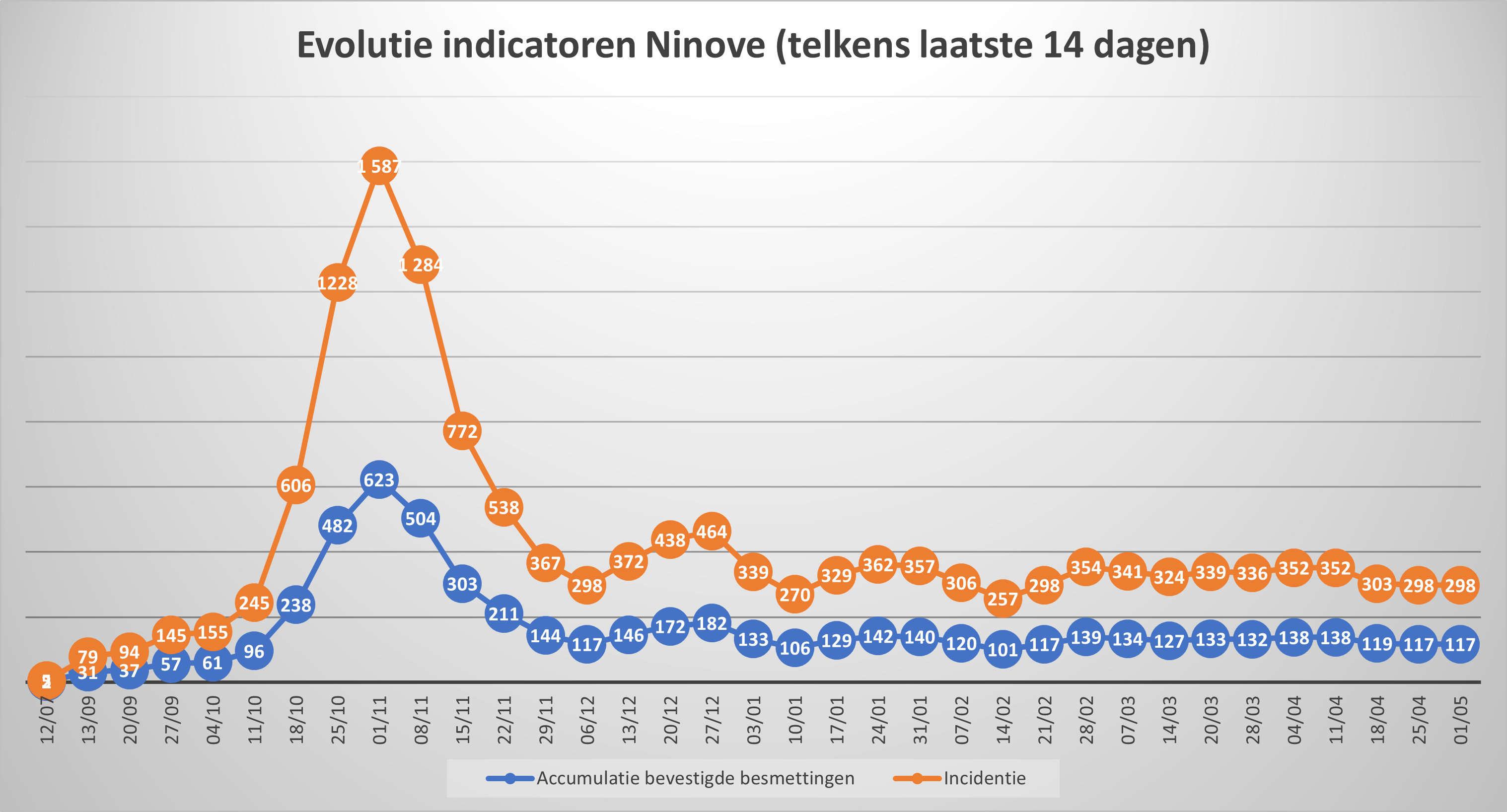 NINOVE – Volgens Sciensano zijn de afgelopen 14 dagen 117 bevestigde besmettingen genoteerd in Ninove. We brengen deze en andere cijfers van de omliggende steden en gemeenten elke week in kaart.