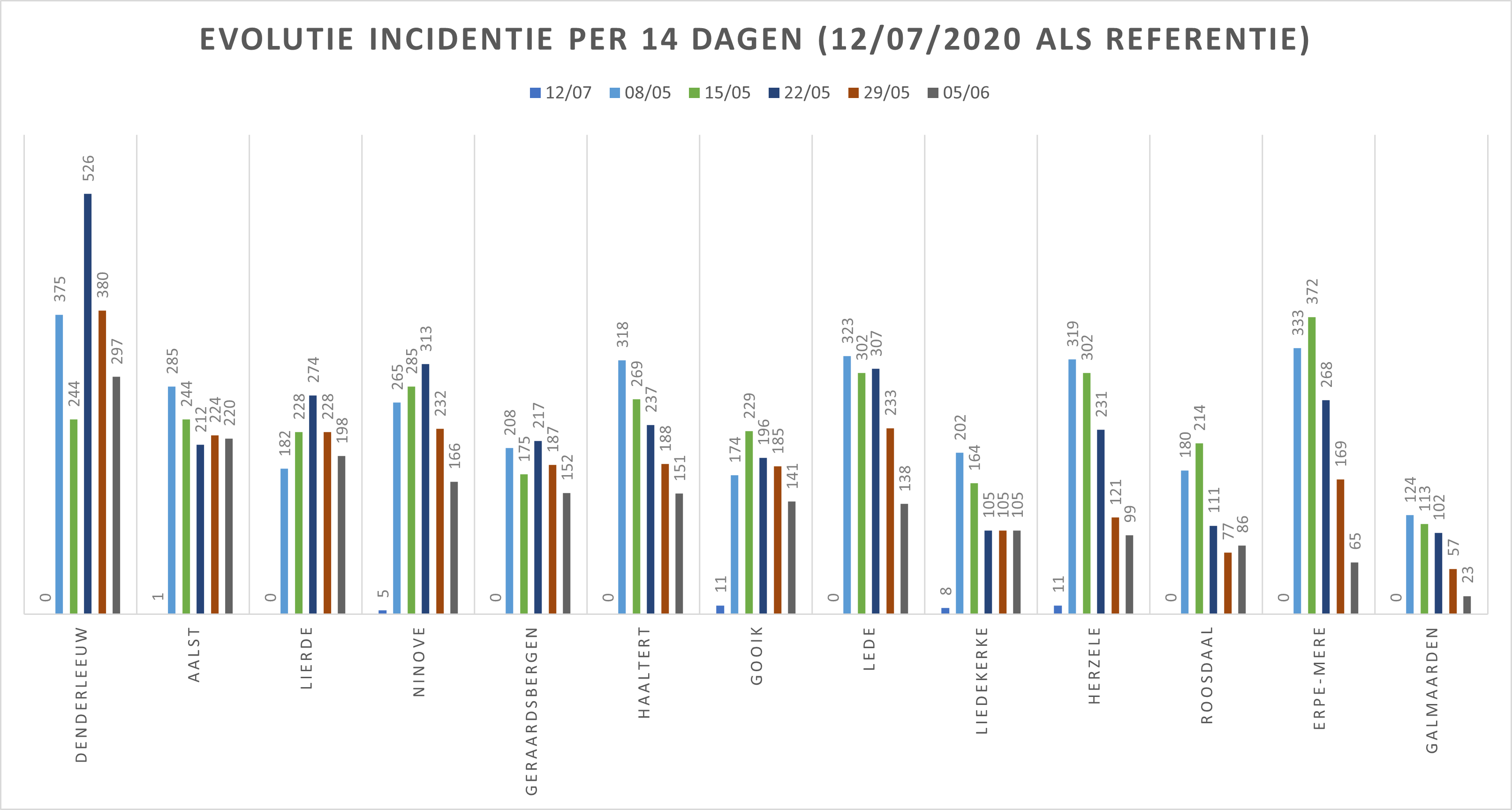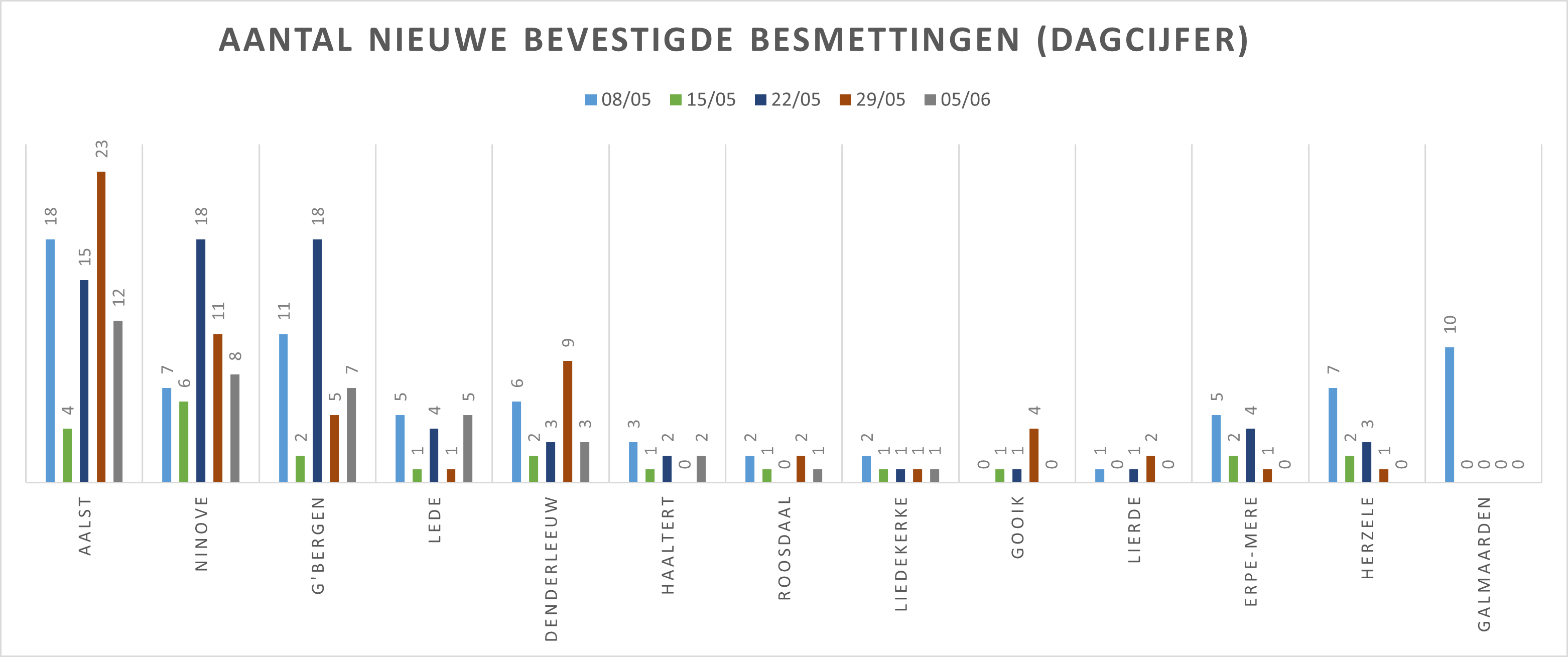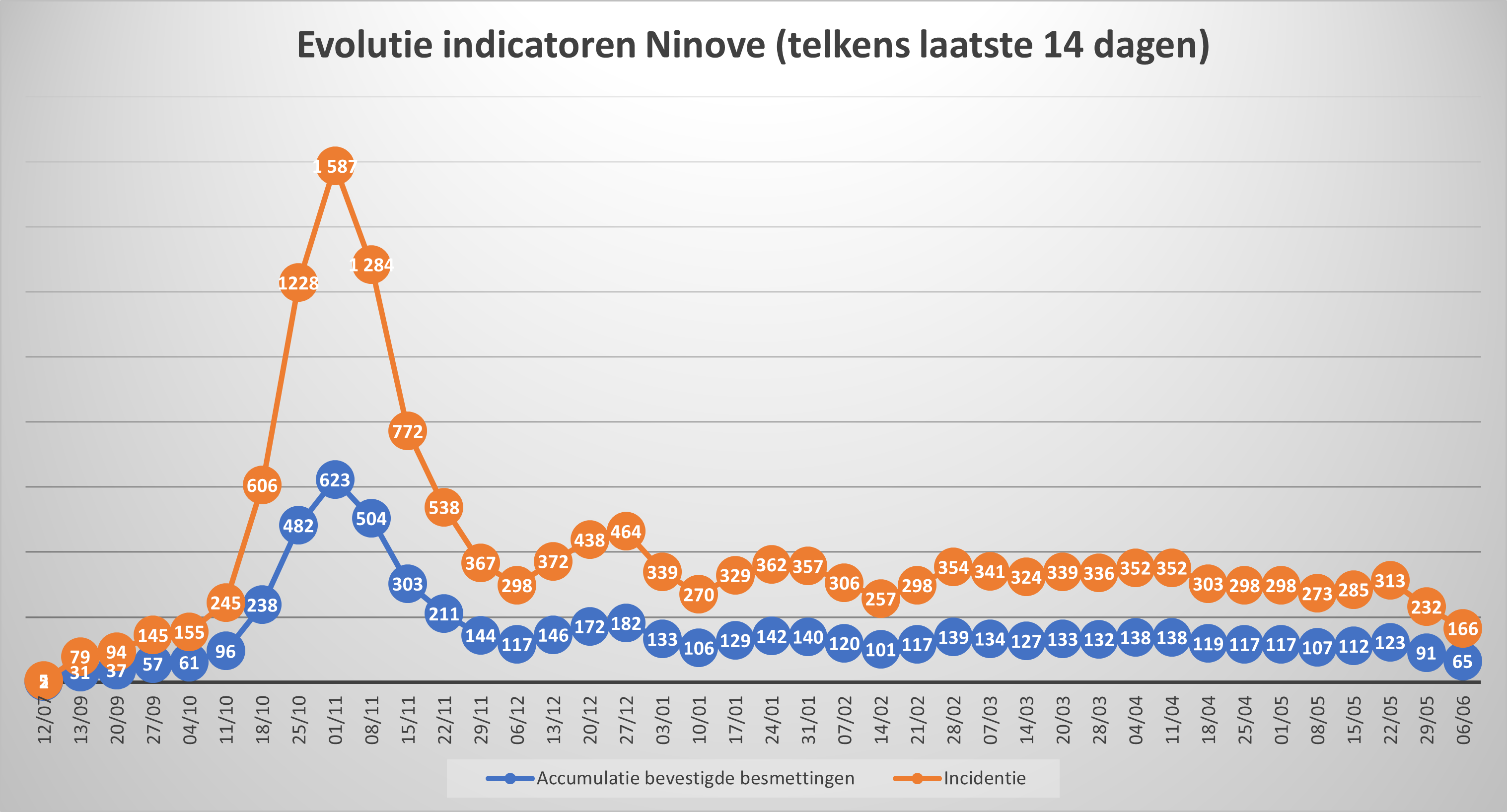 NINOVE – Volgens Sciensano zijn de afgelopen 14 dagen 65 bevestigde besmettingen genoteerd in Ninove. We brengen deze en andere cijfers van de omliggende steden en gemeenten elke week in kaart.