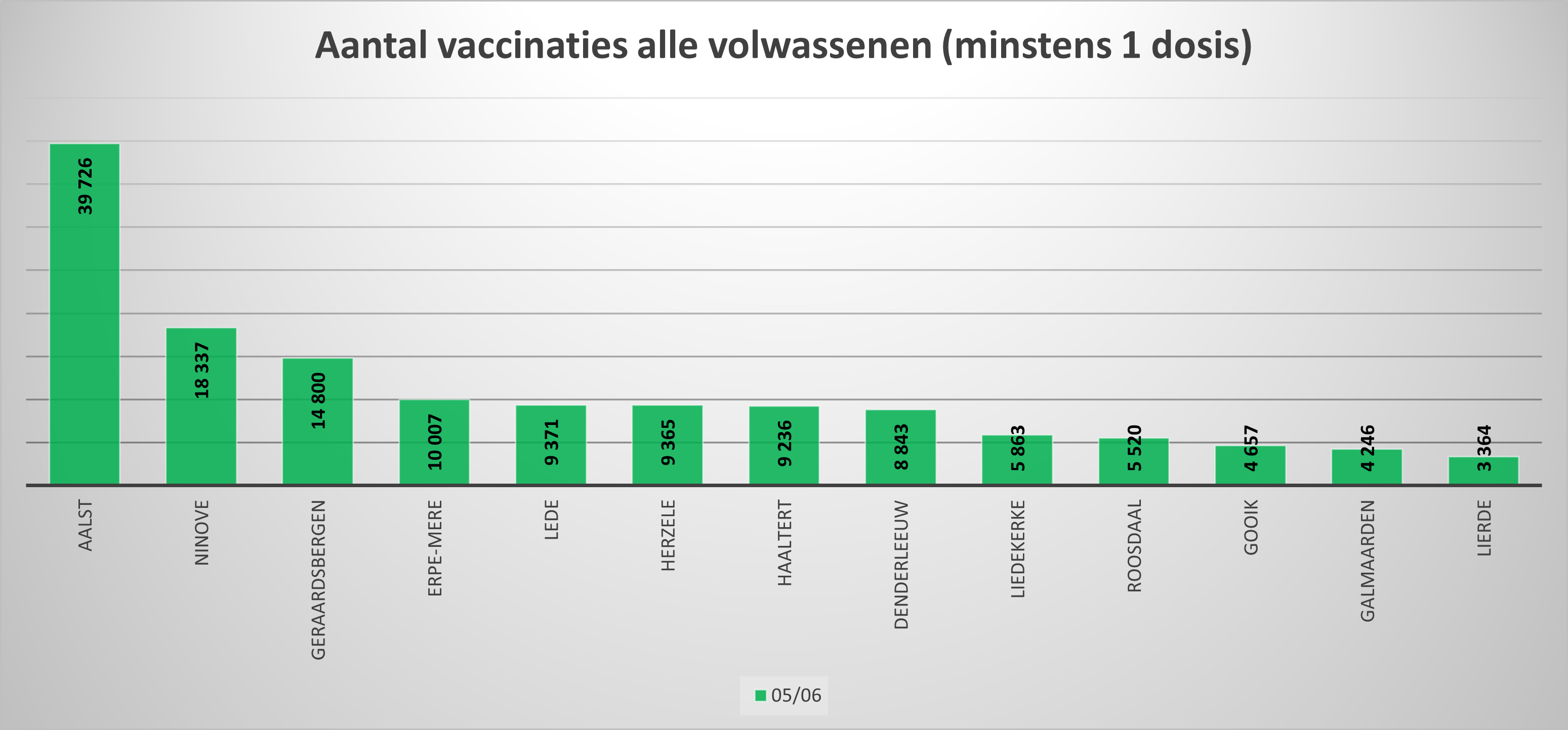 • Tot 05 juni ontvingen 18.337 van alle +18-jarigen minstens 1 vaccinatieprik. Dat is 58,25 % van die bevolkingsgroep.