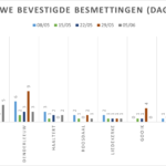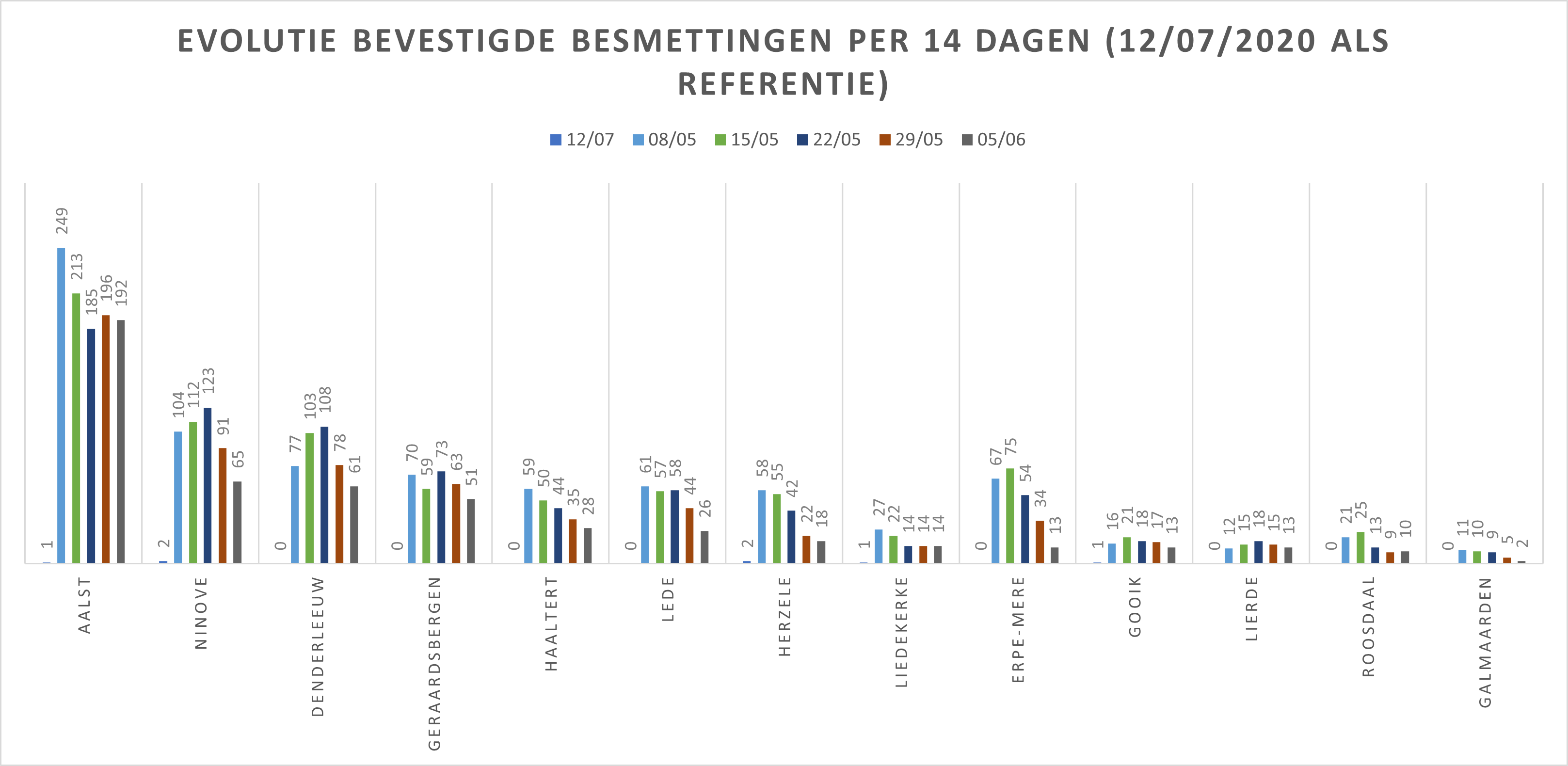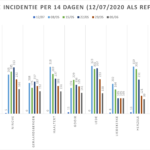 Hieronder een tabel met het aantal bevestigde besmettingen, telkens over een periode van 14 dagen (12 juli 2020 als referentie). Deze en de andere gegevens zetten we in grafieken (bijlagen).