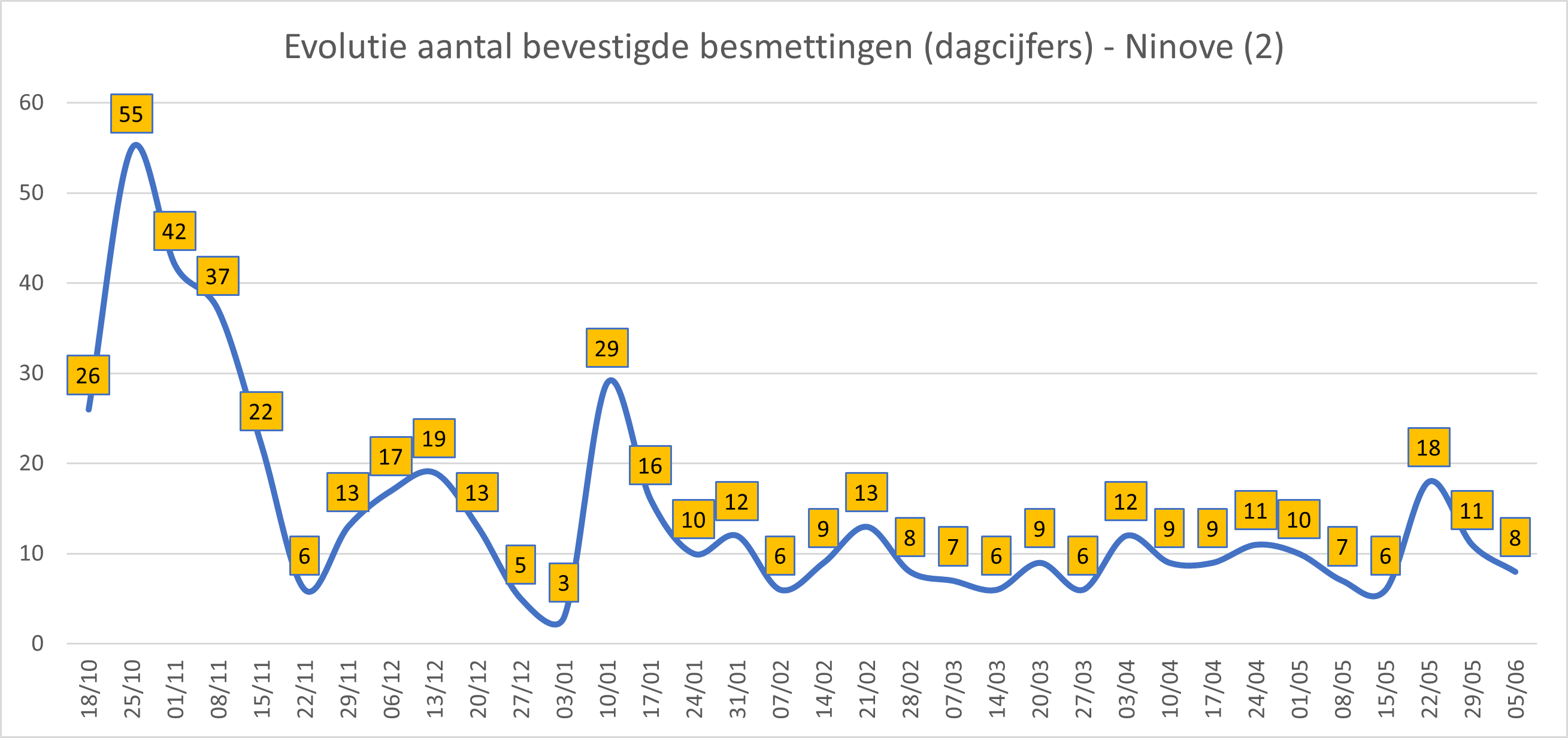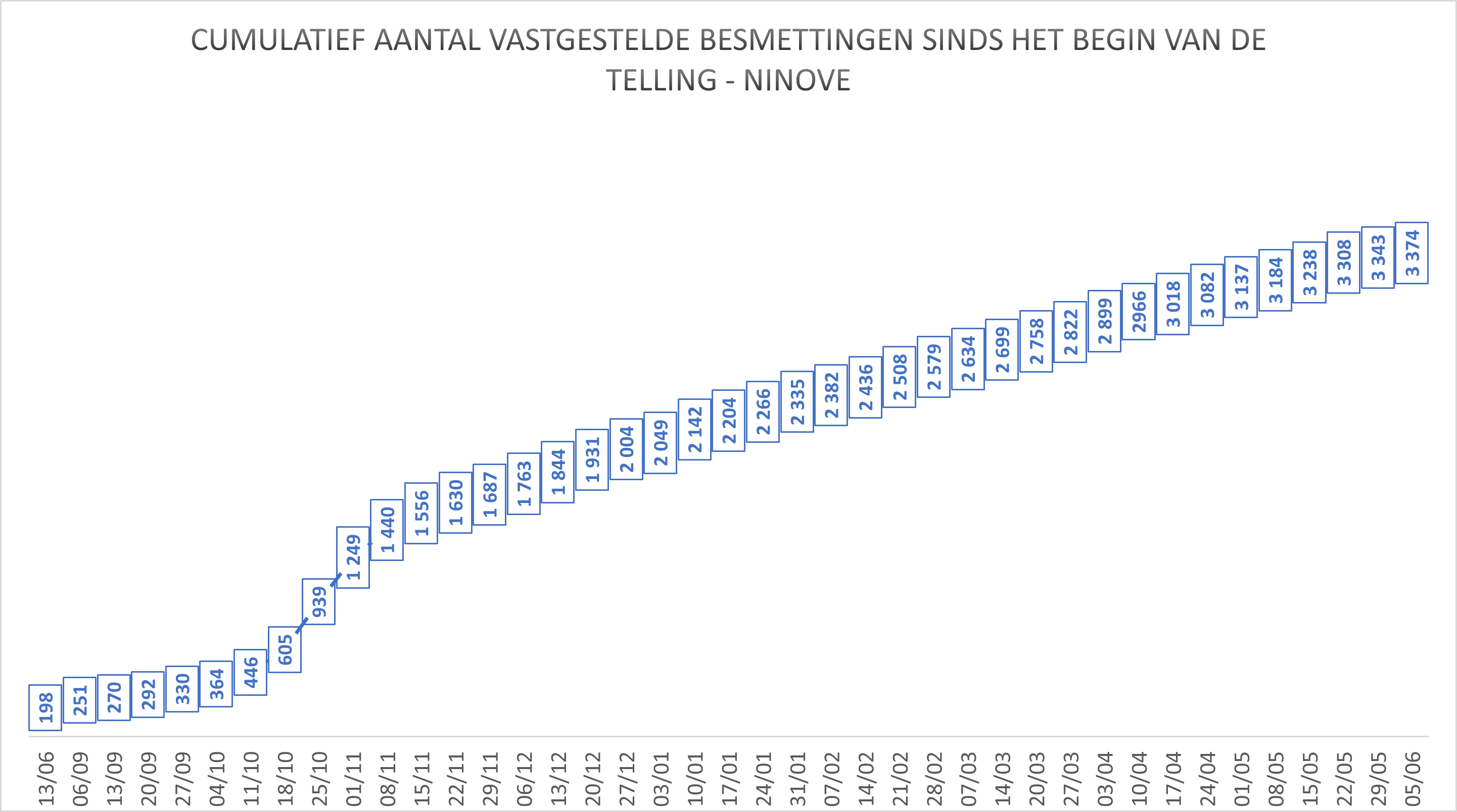 • In totaal zijn in Ninove 3.374 besmettingen genoteerd sinds het begin van de telling.