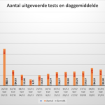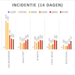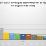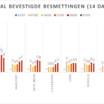 Hieronder een tabel met het aantal bevestigde besmettingen, telkens over een periode van 14 dagen (12 juli 2020 als referentie). Deze en de andere gegevens zetten we in grafieken (bijlagen).