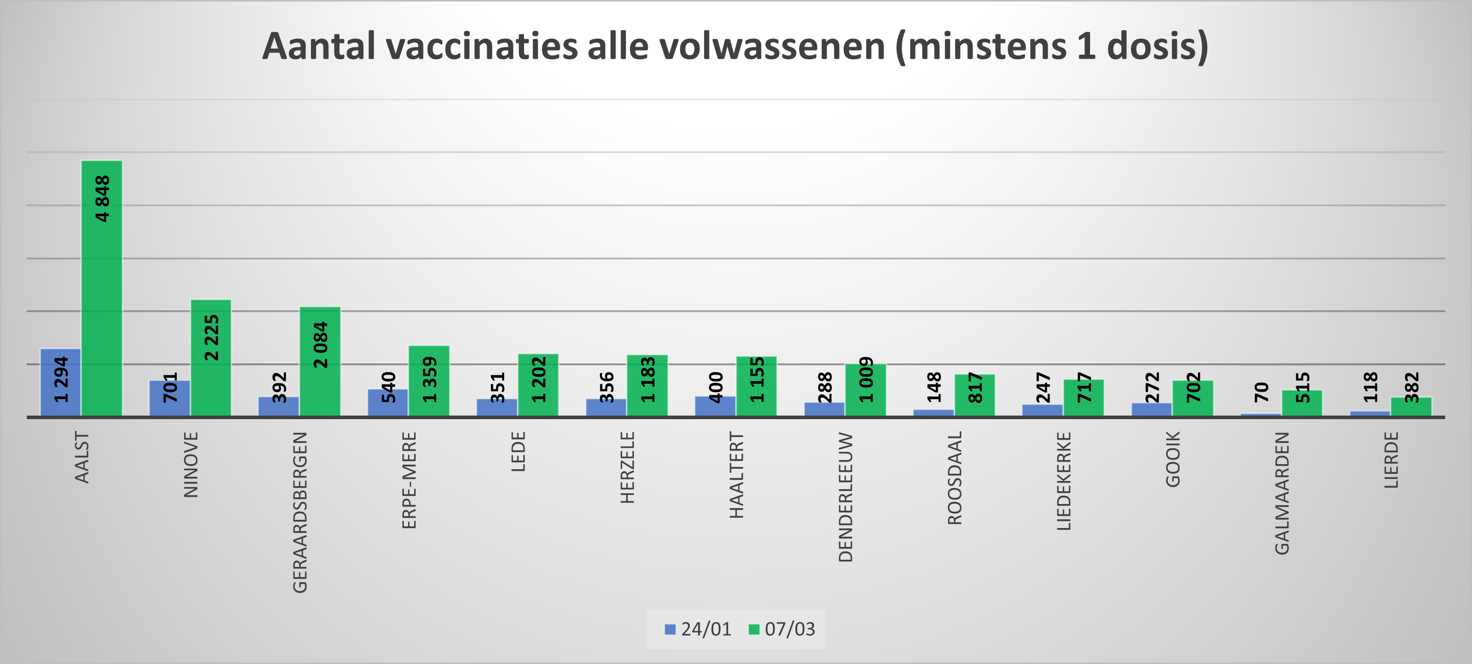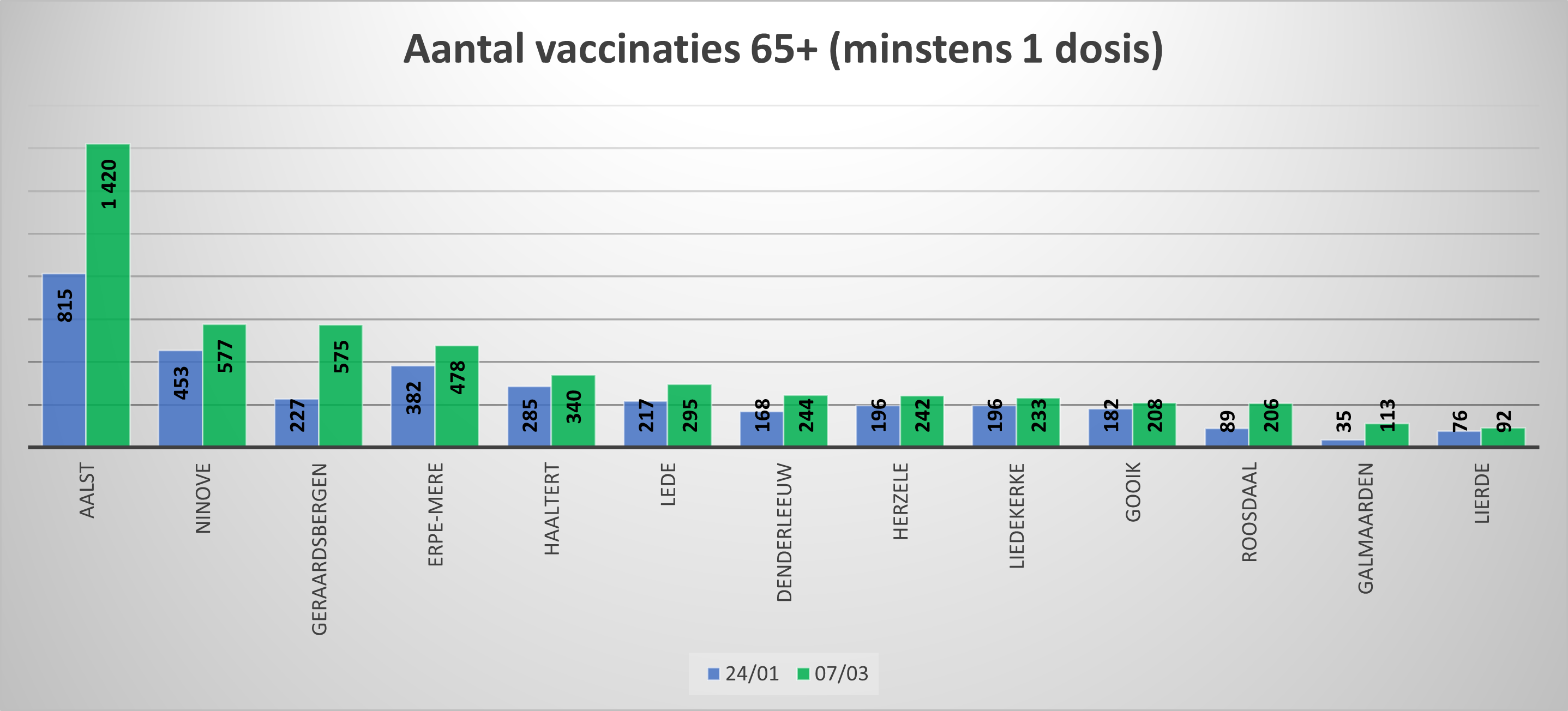- Tot 07 maart kregen 2.225 van alle +18-jarigen minstens 1 vaccinatieprik; 577 vaccins zijn toegediend in de leeftijdsgroep 65+ (ook minstens 1 prik).