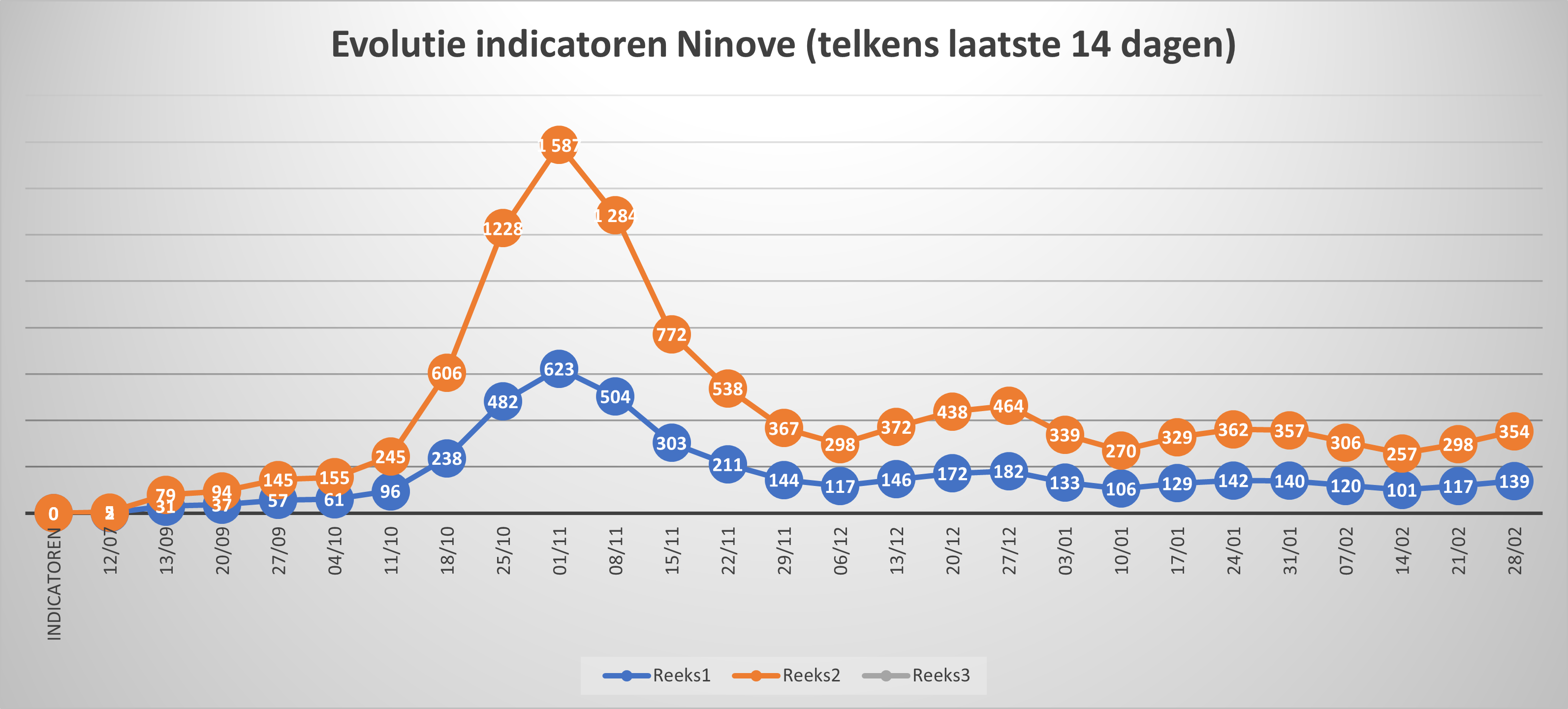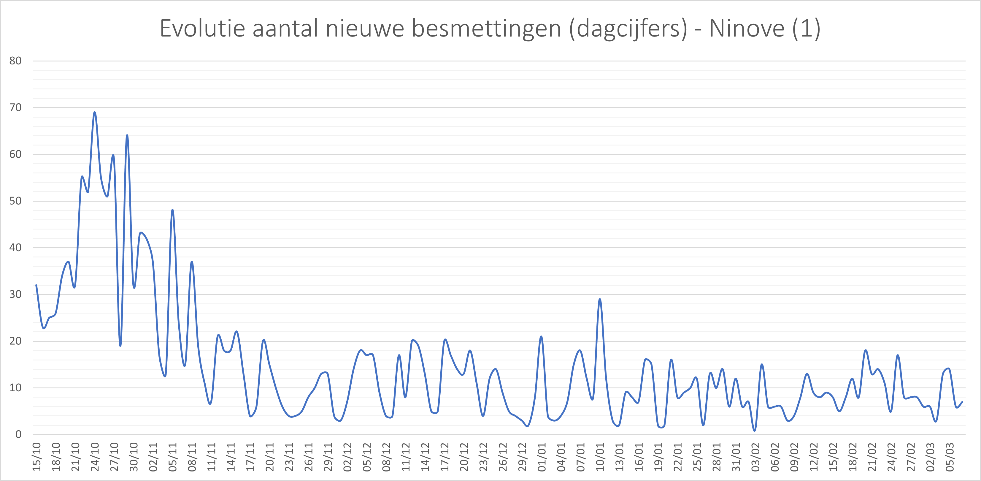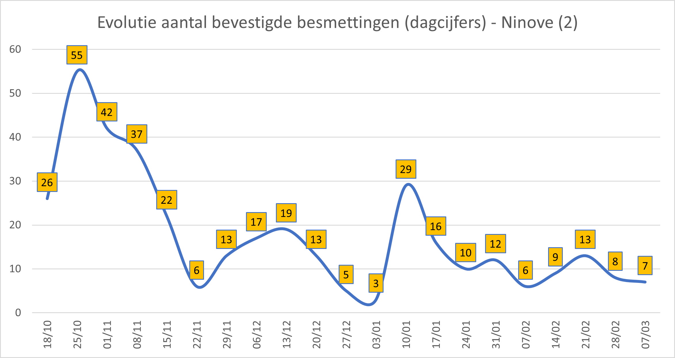 NINOVE – Volgens Sciensano zijn de afgelopen 14 dagen 134 bevestigde besmettingen genoteerd in Ninove. We brengen deze en andere cijfers van de omliggende steden en gemeenten elke week in kaart.